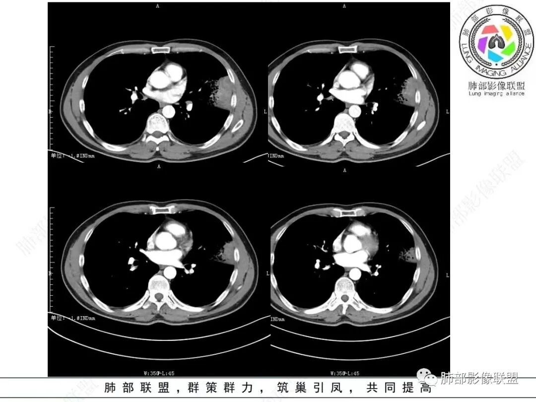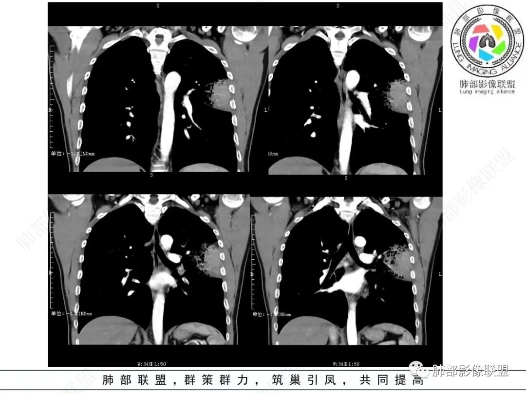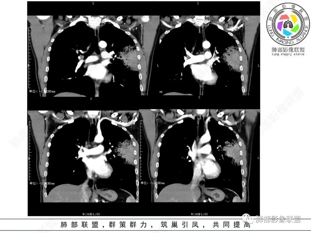 2.左肺上叶大片状混合密度影,未见空洞,实变影主要位于胸膜下,长轴与胸膜平行,实变区内部密度不均、其内可见多发小斑片状低密度影,磨玻璃影多位居肺门一侧,可见网格,磨玻璃影边界多可分辨,重力分布趋势。病灶区支气管显示较为通畅,进入外围实变区渐至消隐。病灶轻度不均匀低强化,病灶区肺动脉显示较良好,未见破坏。
