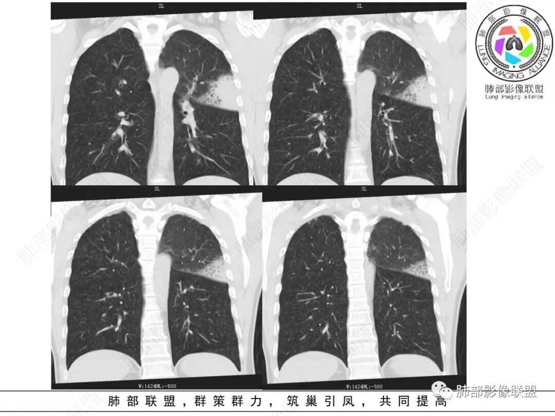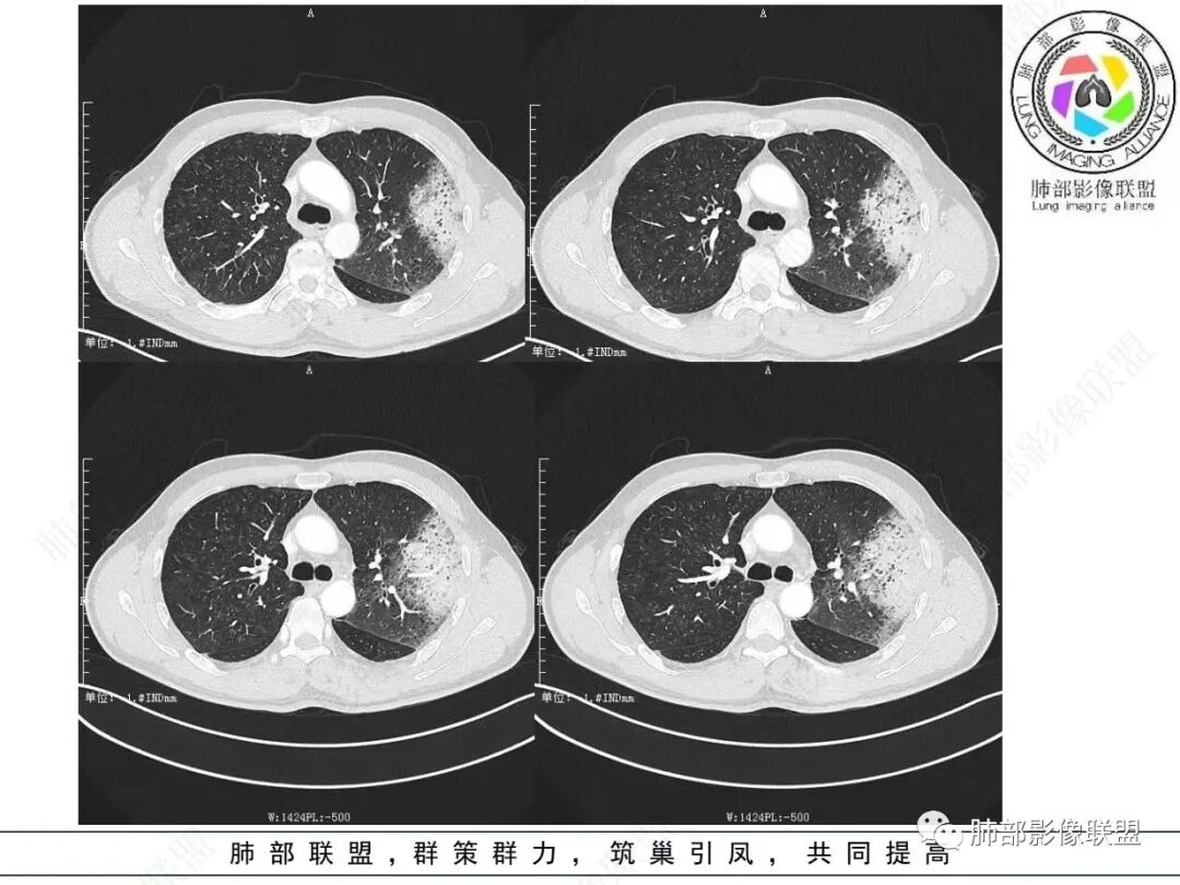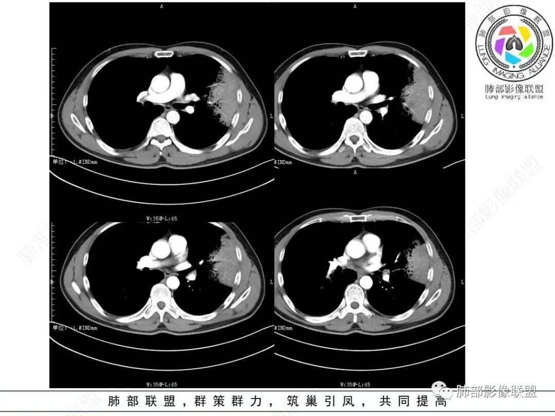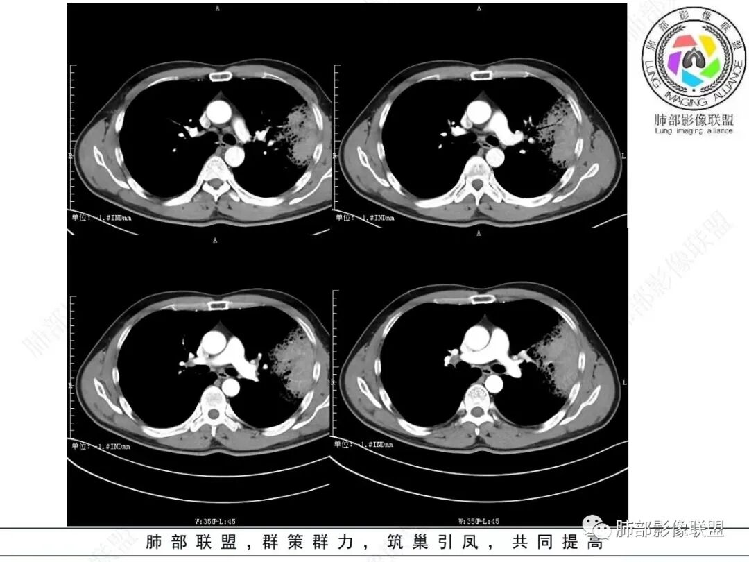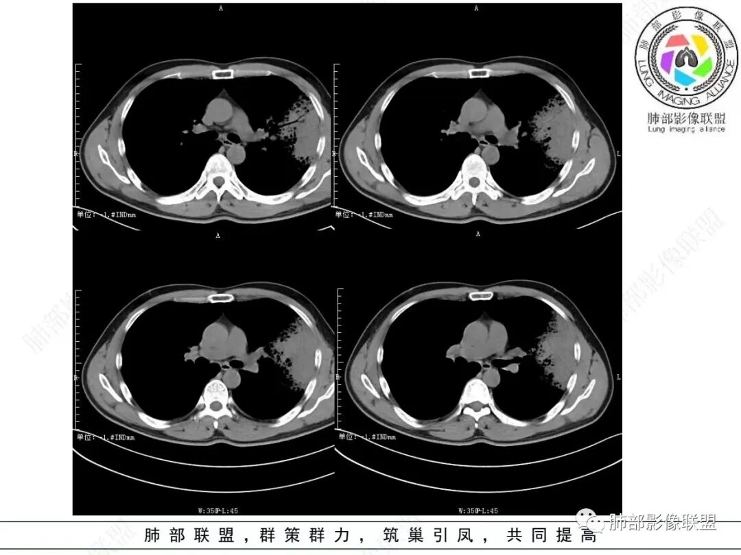 男,46,咳嗽半年,加重10天,白粘痰,偶有痰血。胸部CT:左肺上叶舌叶大片实变影,边缘GGO,长轴沿胸膜及叶裂展开,重力依赖,胸膜叶裂阻隔,内见蜂窝,钱币征,枯枝。强化不均匀,血管造影征。考虑粘液腺癌,鉴别大叶性肺炎、干酪性肺炎等。