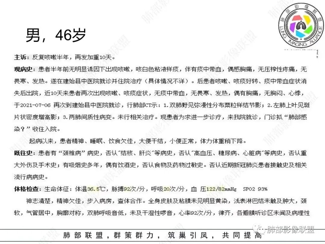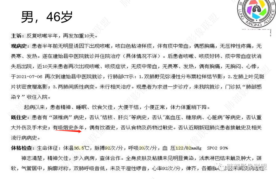 46岁男性,病史半年,近期咯血,无肺气肿背景