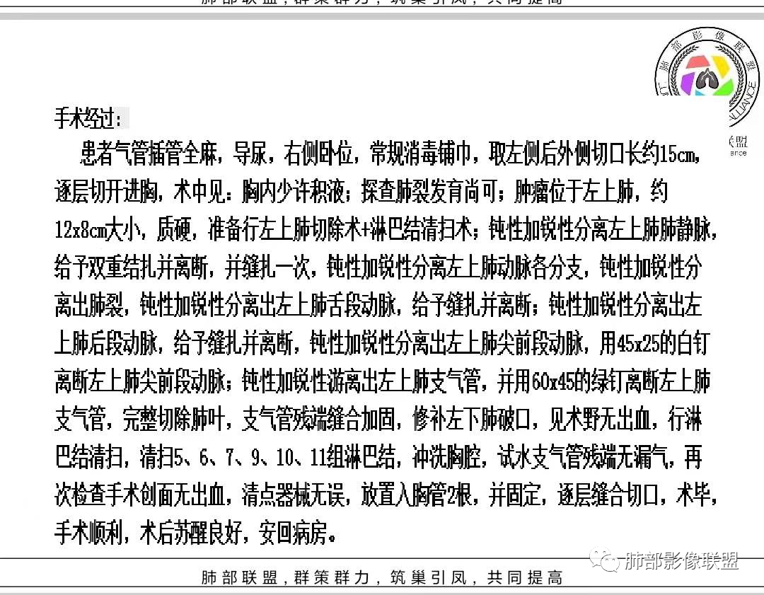 男,46岁,反复咳嗽半年,痰中带血,加重10天,左肺上叶大片状实变影,边缘模糊,病灶内见蜂窝影及僵硬支气管,双肺内见多发小结节,增强扫描,病灶明显强化,左侧胸壁增厚,考虑恶性病变,粘液性腺癌可能。