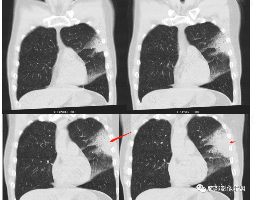 双肺广泛分布微小磨玻璃密度结节影,腺泡结节样分布,密度大小较为均匀一致。