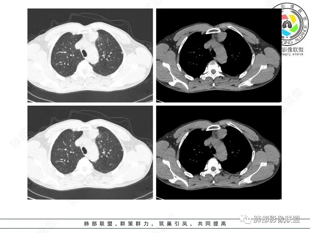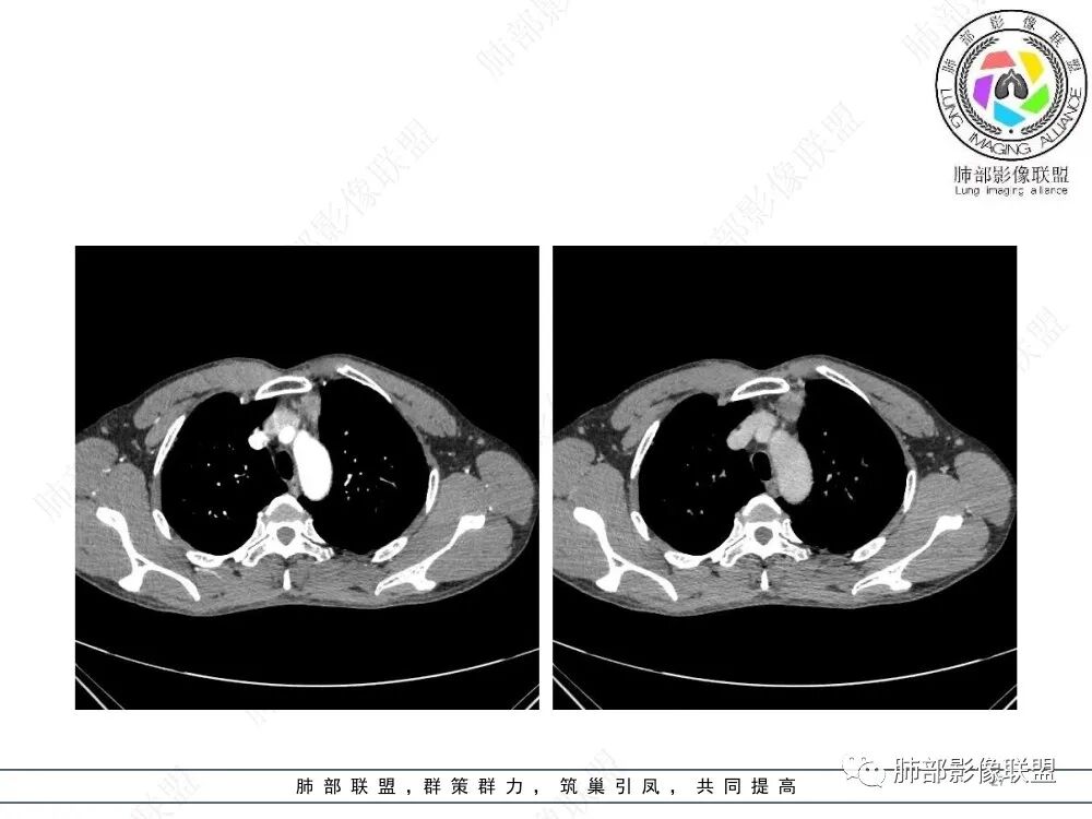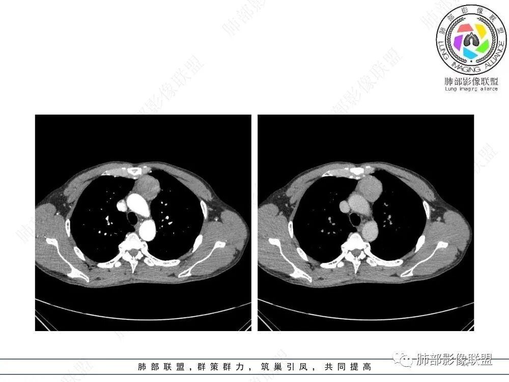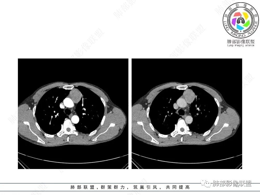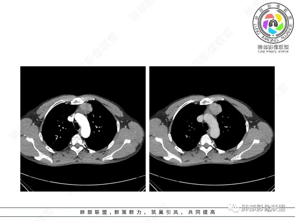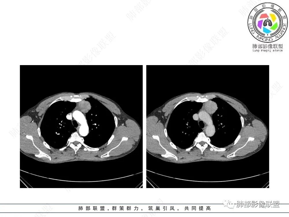 流心明智:男,47,咳嗽、咳痰1年余。胸部CT:前纵膈偏左类圆形肿块,瘤肺界面清晰光整,纵隔侧部分层面絮状影?平扫密度较均匀,增强后轻度强化,内可见宽带及线样低密度分隔。邻近左上肺受压凹陷。考虑胸腺肿瘤,AB型?胸腺Ca?鉴别淋巴瘤、N源性肿瘤、CD等。