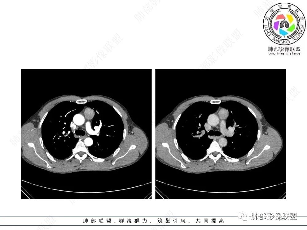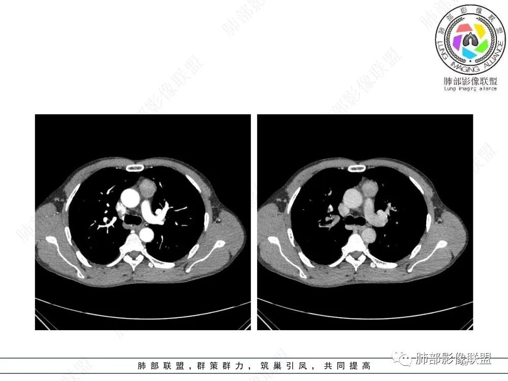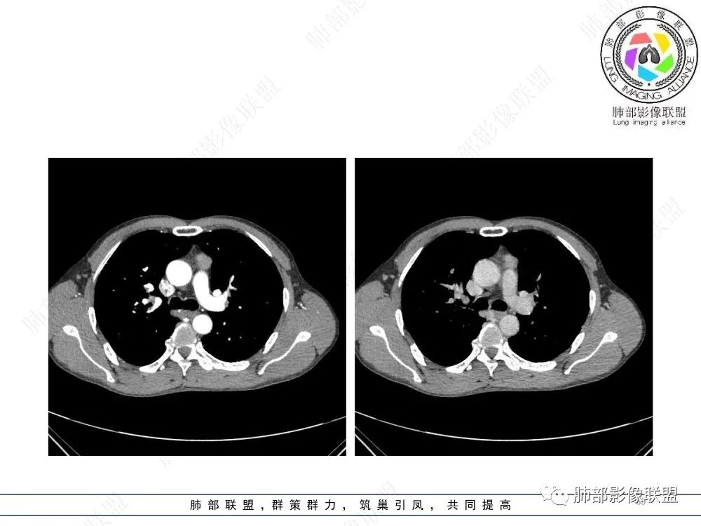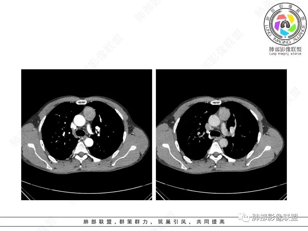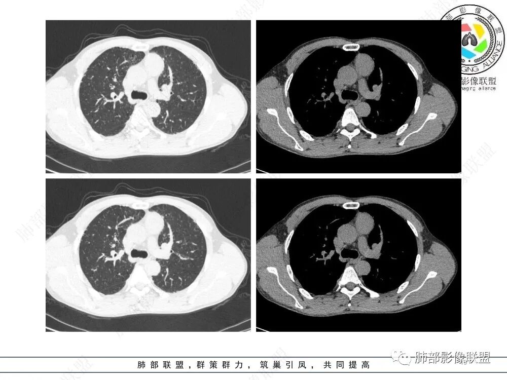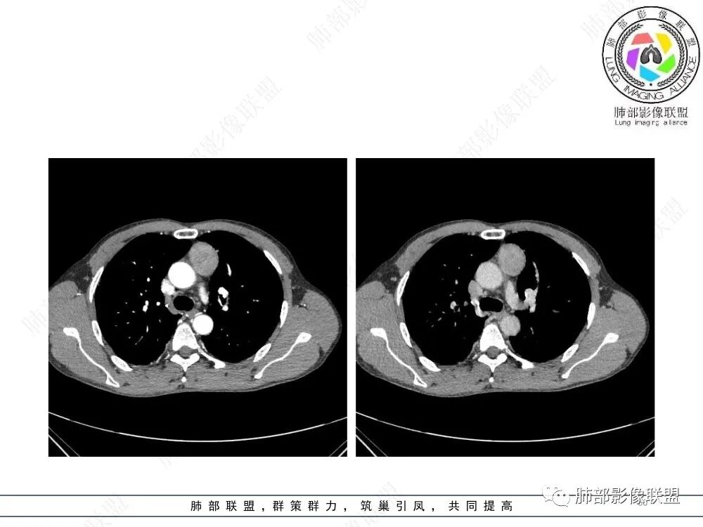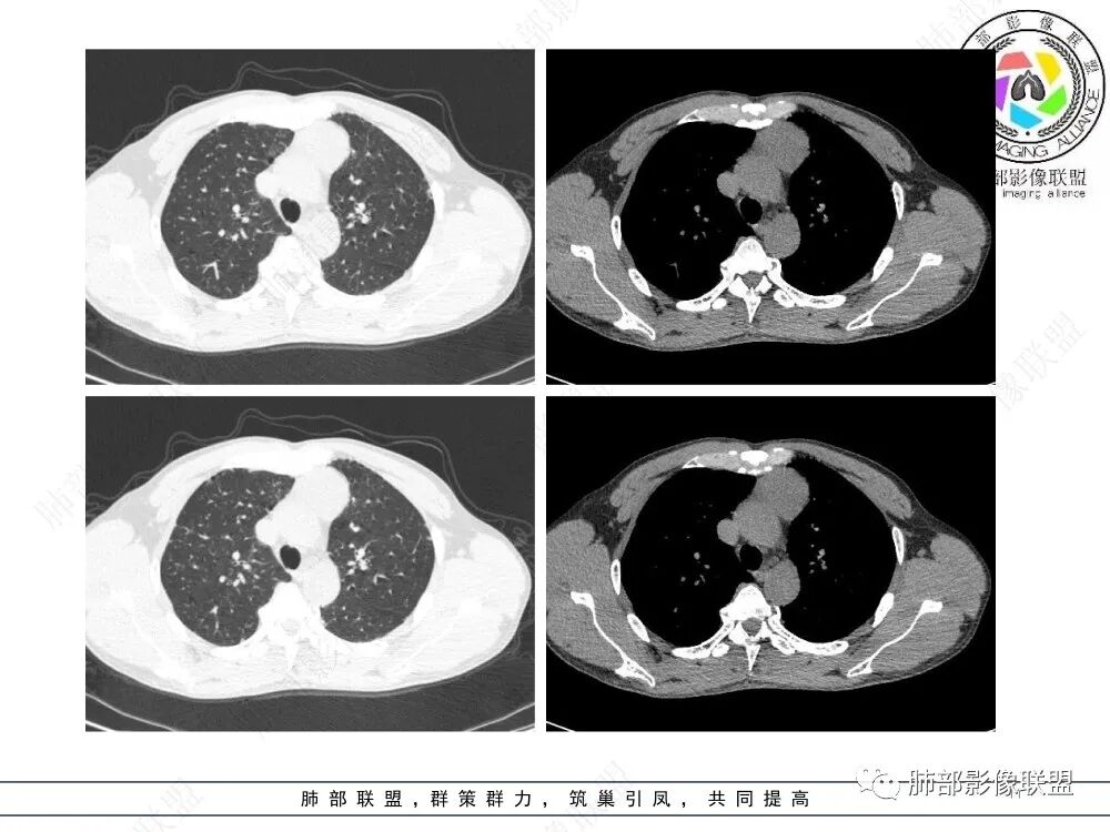 流心明智:男,47,咳嗽、咳痰1年余。胸部CT:前纵膈偏左类圆形肿块,瘤肺界面清晰光整,纵隔侧部分层面絮状影?平扫密度较均匀,增强后轻度强化,内可见宽带及线样低密度分隔。邻近左上肺受压凹陷。考虑胸腺肿瘤,AB型?胸腺Ca?鉴别淋巴瘤、N源性肿瘤、CD等。