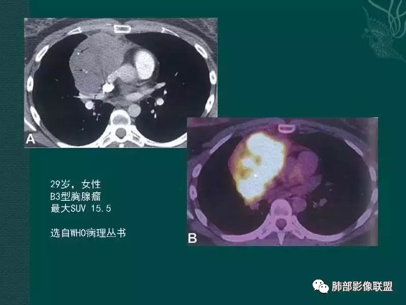 3、 病 例 小 结:40岁以上,前纵隔偏侧性生长的肿块,常规考虑胸腺瘤。难点就在于胸腺瘤的分型。但是对于前纵隔占位影像诊断的关键在于区分胸腺囊肿、胸腺瘤、胸腺癌及其他恶性肿瘤。至于胸腺瘤,主要在于判断有无侵袭性。