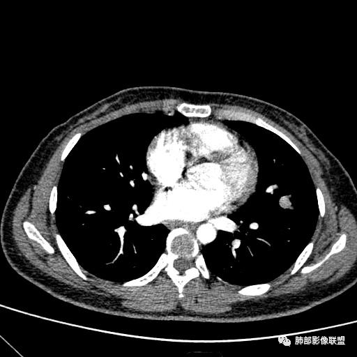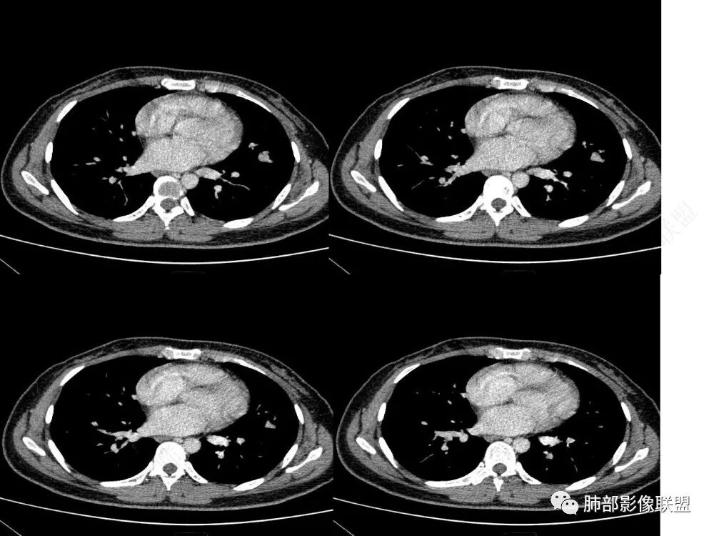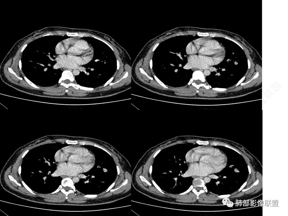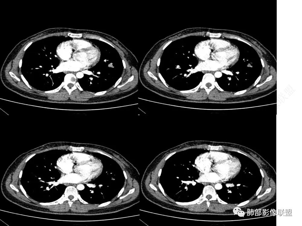 3)边界清楚,未显示相关支气管及血管出入,强化明显,应当想到硬化性肺细胞瘤。