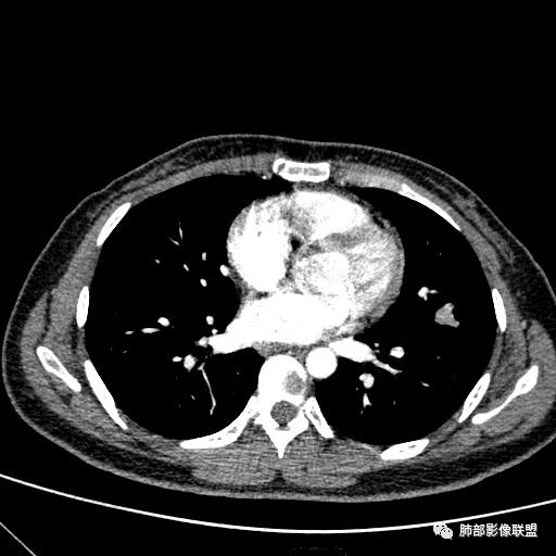 2、影像特点:左肺上叶舌段实性密度结节,边界清楚,略呈不规则三角形,边缘多平直,未见分叶、毛刺及明显收缩。密度均匀,未见钙化、脂肪密度或低密度液化空洞,持续渐进强化。未显示相关支气管及血管出入、血管贴边等。未见明确卫星病灶。双肺门及纵隔未见增大淋巴结。