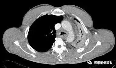 CT早期表现缺乏特征,主要为气管、支气管管壁增厚,伴邻近脂肪浸润
