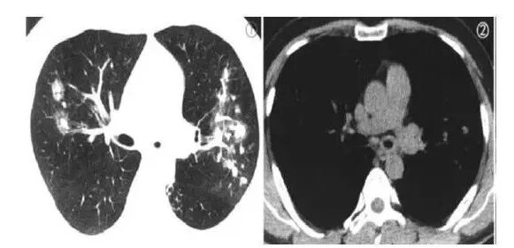 CT表现气管支气管内膜增厚,多个支气管受累,常有肺不张、肺内播散
