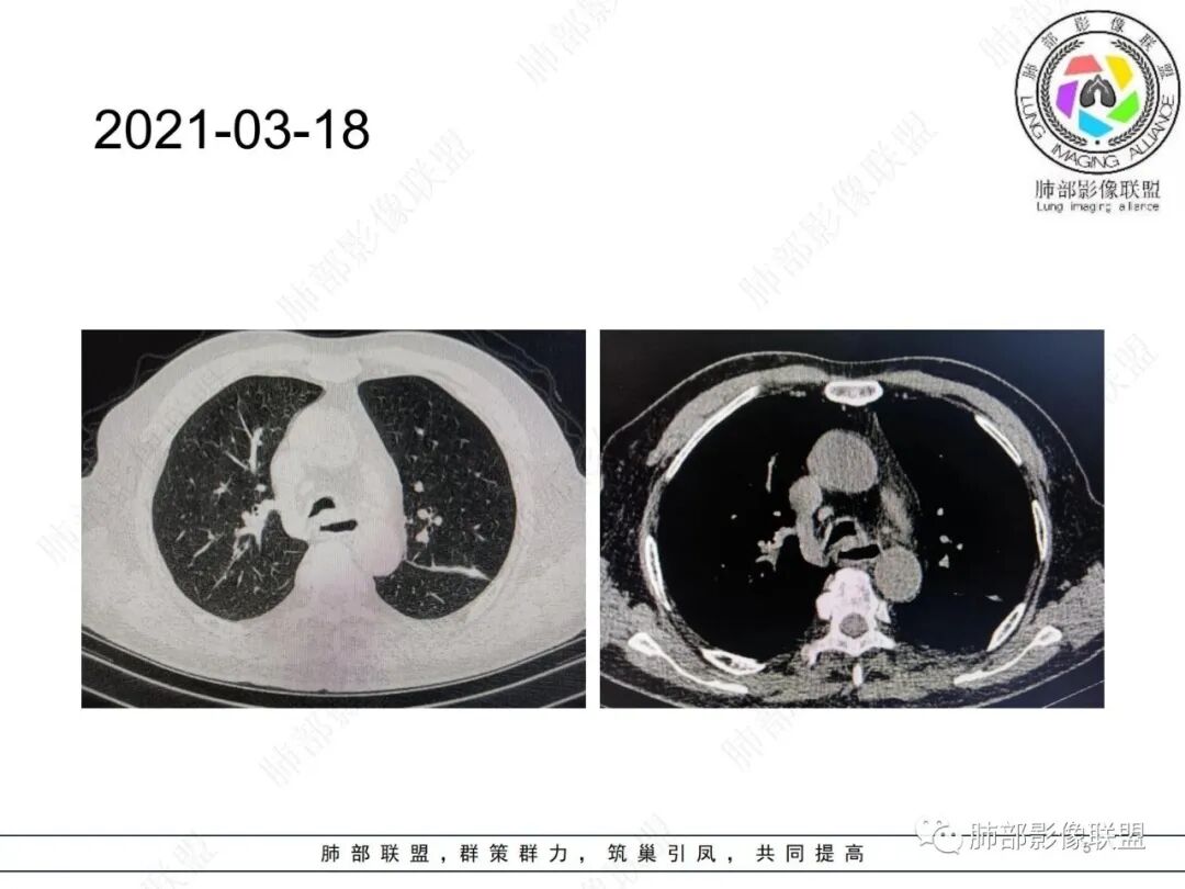 前后5个月左主支气管壁进行对称增厚及塌陷狭窄(解释咳喘加重),左侧胸廊变窄,左肺叶体积缩小,有实质和间质混合病变,向外周间质引流特点。复查右肺上尖后段多发小树丫及融合特点,TB?支气管镜活检。