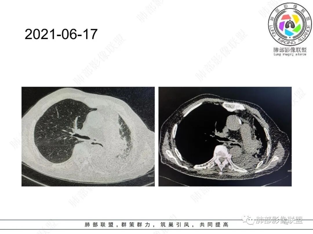 左肺上叶沿支气管条形密度,左叶间胸膜局部增厚。三个月复查左肺体积变小,肺门旁团状实变,左侧胸腔积液。首诊倾向感染性病变,结核?鉴别肿瘤,鳞癌,小细胞癌。
