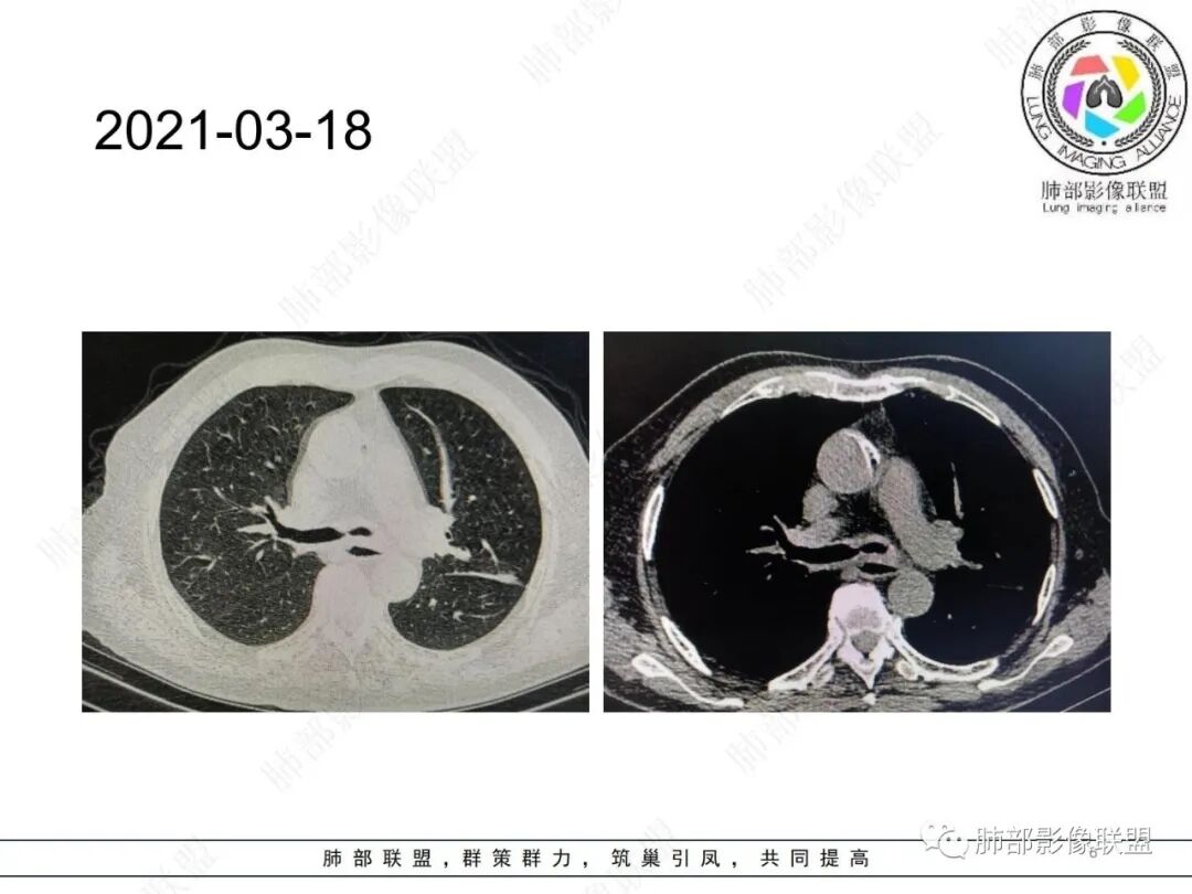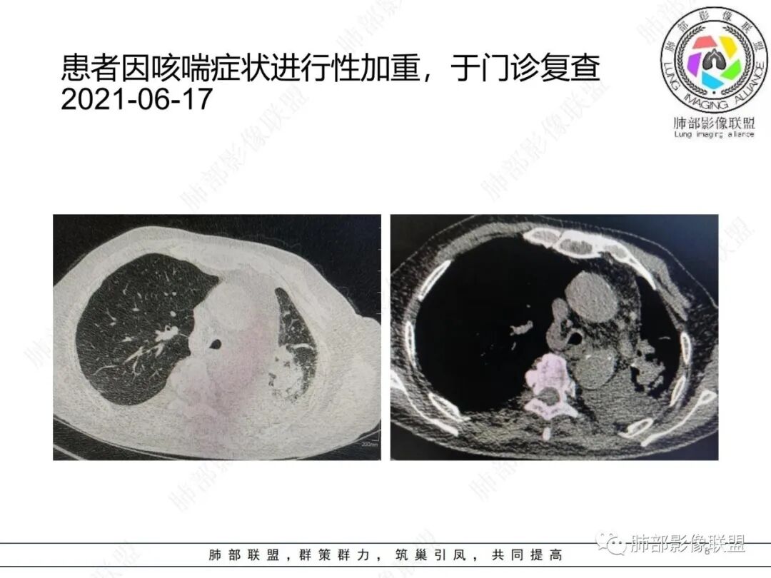 不符合,前后三个月左主支气管壁进行对称增厚及塌陷狭窄(解释咳喘加重),左侧胸廓变窄,左肺叶体积缩小,有实质和间质混合病变,向外周间质引流特点。