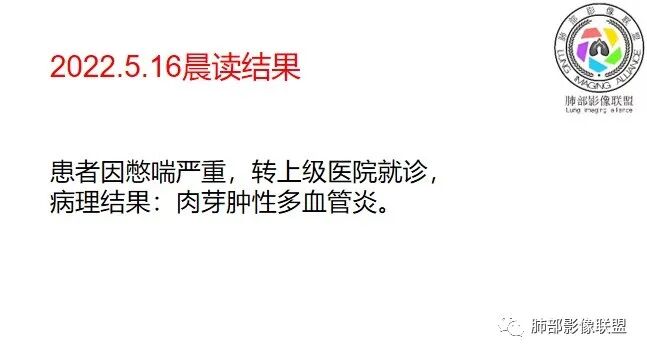 @马云凤 黄骅市人民医院 呼吸?其实早上很纠结,三不像,结核,淀粉,鳞癌都有解释不通的地方,血管炎呢,影像又不典型。不过一看你发的视频和你说的诊疗过程,心里就有底了。