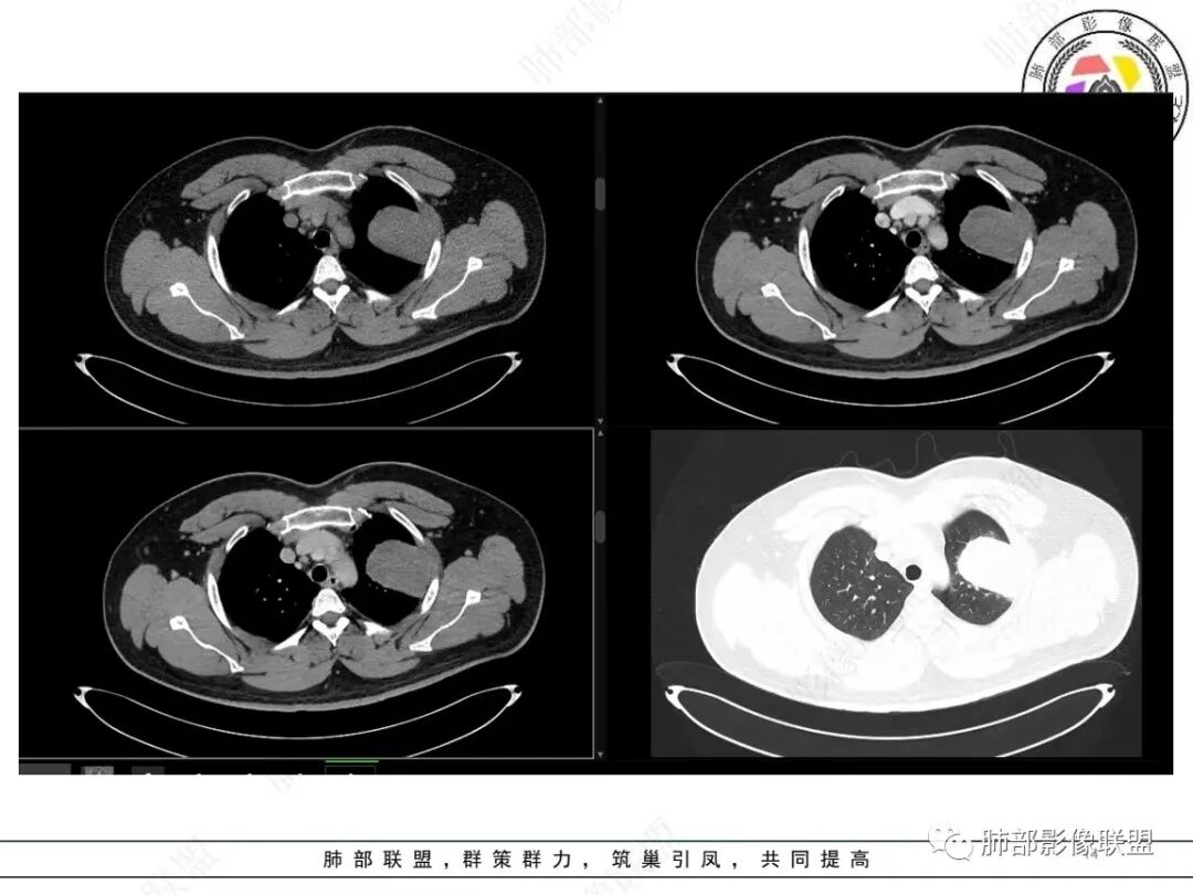 影像表现:左肺上叶占位合并出血,胸膜栽赃,边缘强化,局部见血管影,中心密度20Hu,无强化,符合非液化坏死。定位:肺内,定性恶性(明显血管影,栽赃排除错构瘤,中心无强化排除PSP,无明显清楚的坏死边界,强化不符合肉芽肿,排除结核),年龄轻,无长时间吸烟史和肺气肿改变,肉瘤样癌可能性很小,与支气管无确切关系,所以病理类型考虑来源于肺间叶组织的肉瘤,骨外尤文?滑膜肉瘤?