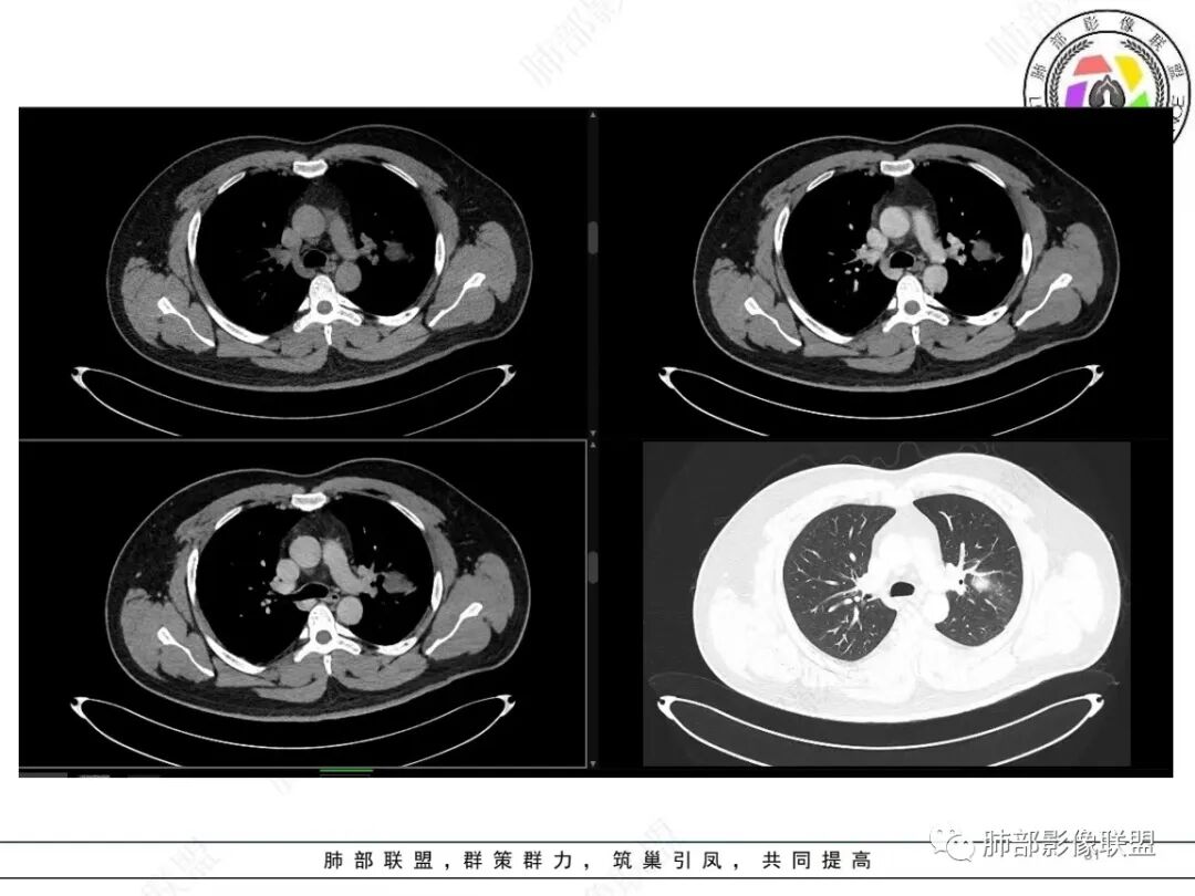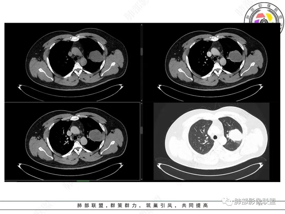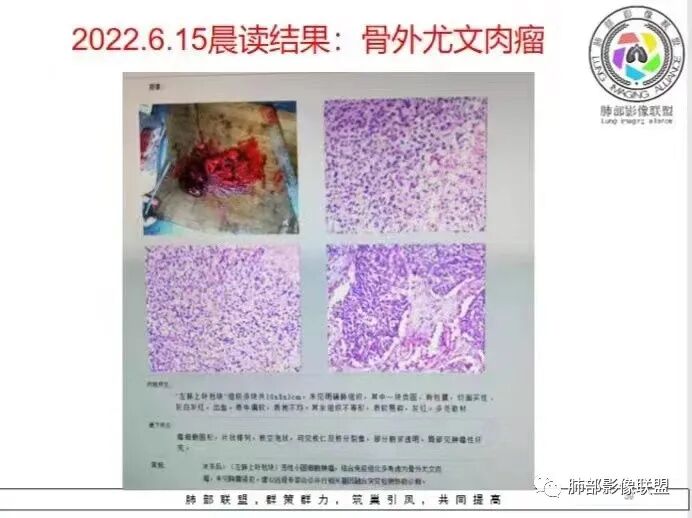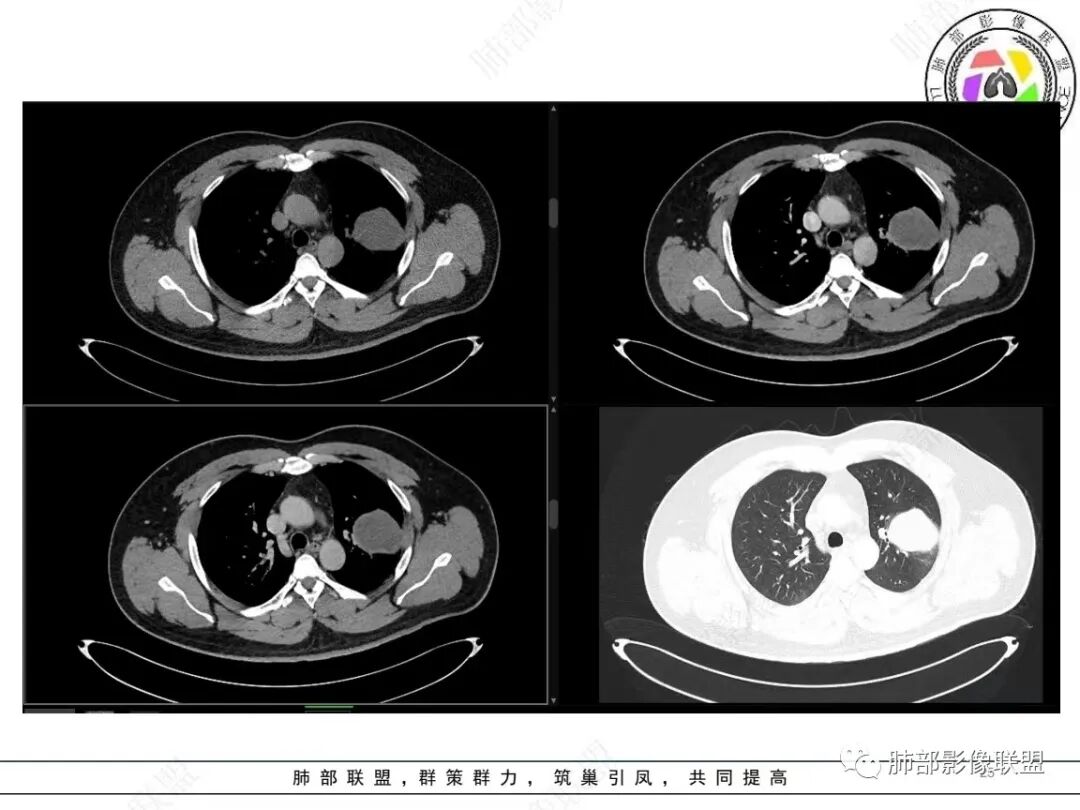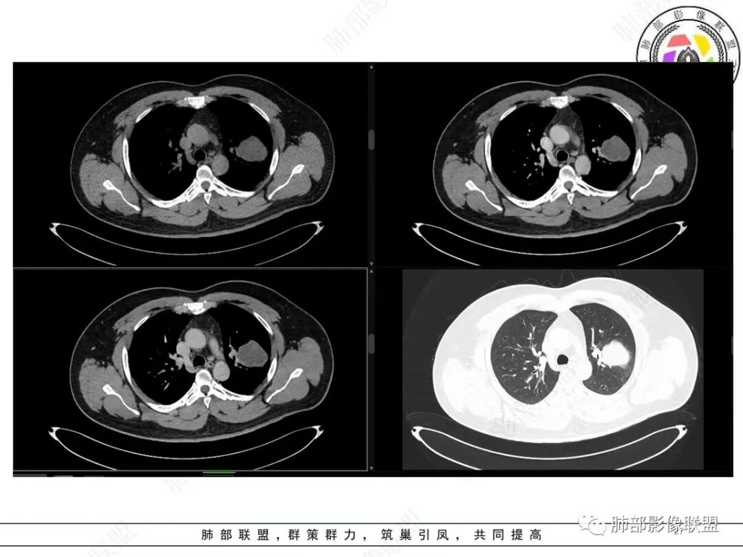 定位肺内明确,来源间叶组织明确,年龄和吸烟史情况排除肉瘤样癌,剩下的就基本上只有骨外尤文和滑膜肉瘤了,再加上强化低,骨外尤文就肯定首先考虑。