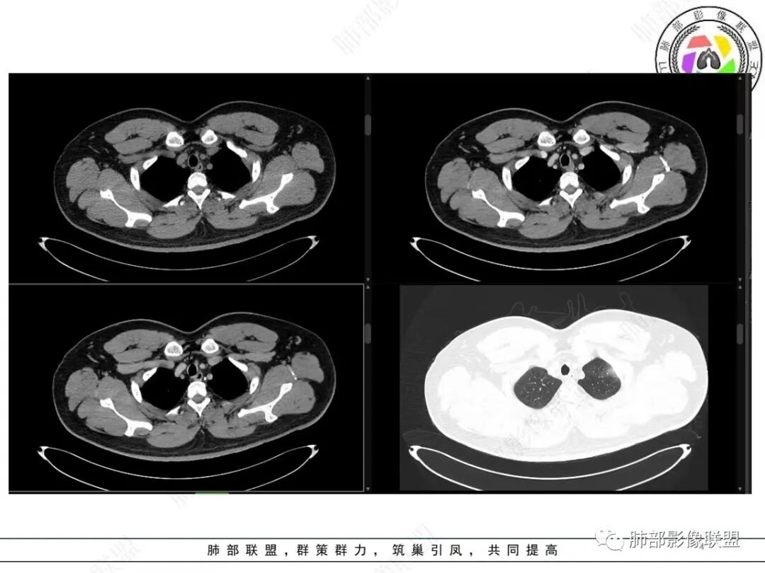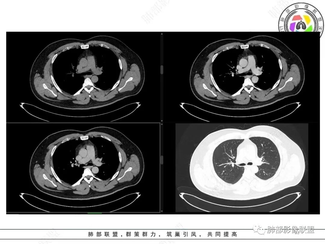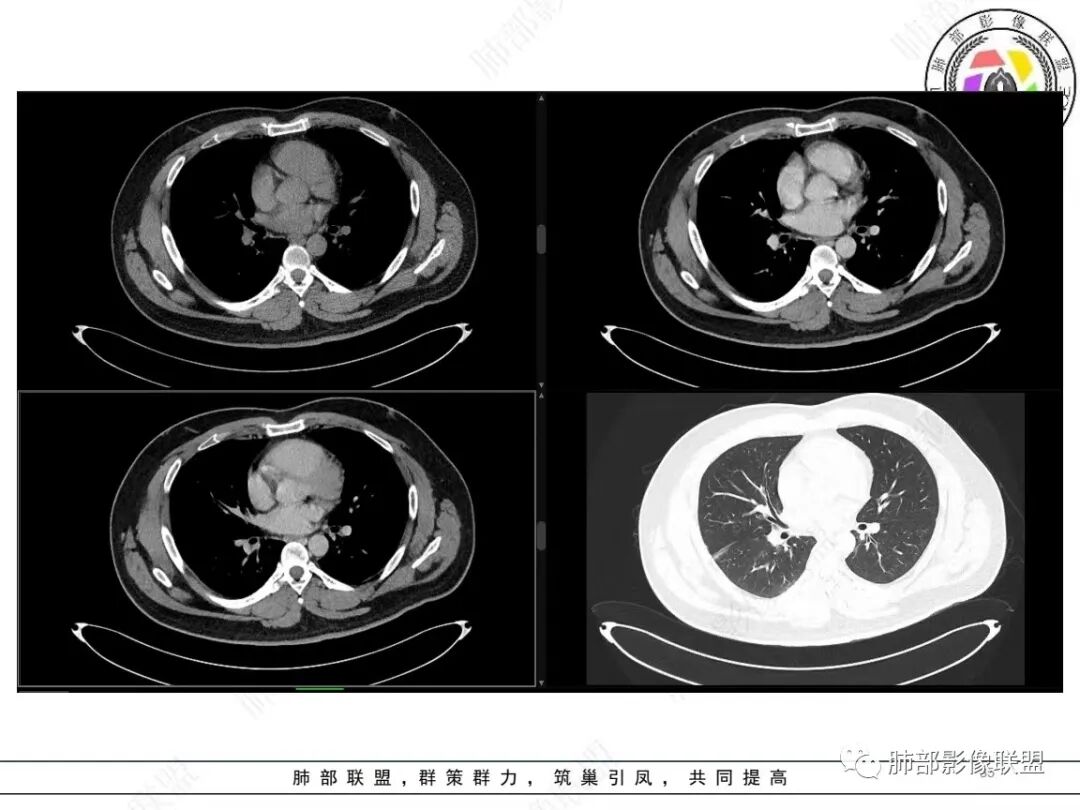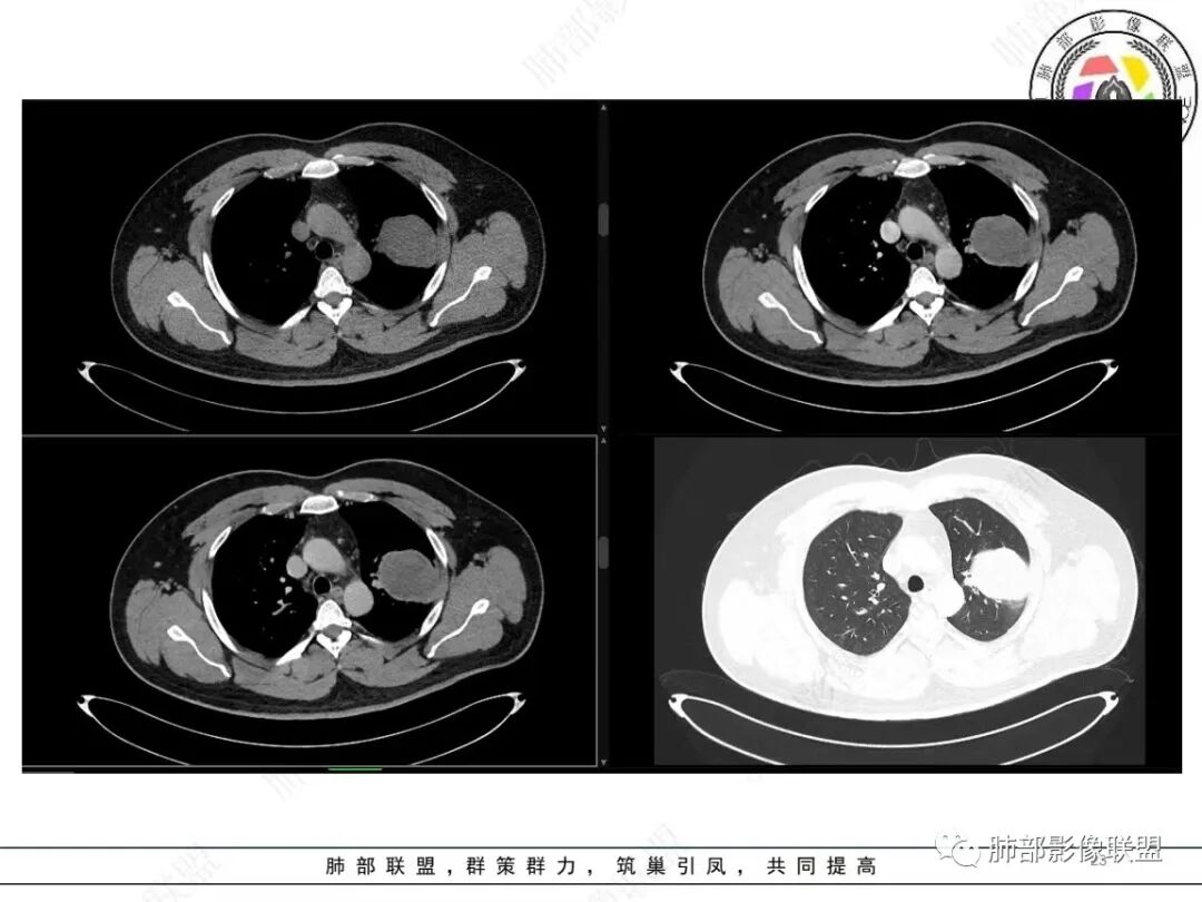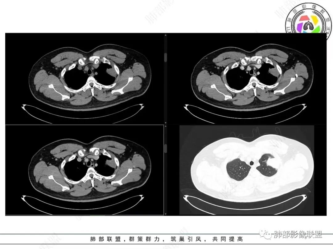 定位肺内明确,来源间叶组织明确,年龄和吸烟史情况排除肉瘤样癌,剩下的就基本上只有骨外尤文和滑膜肉瘤了,再加上强化低,骨外尤文就肯定首先考虑。