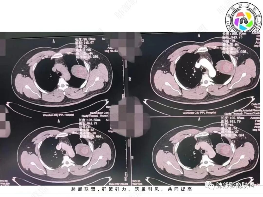 左上肺软组织肿块,周围散在磨玻璃影,界不清,窄基底贴于胸壁,胸膜下脂肪间隙不清,呈低强化,胸膜下见。与主病灶强化方式一样的病变,2R区见肿大淋巴。考虑恶性,间叶组织来源合并出血。
