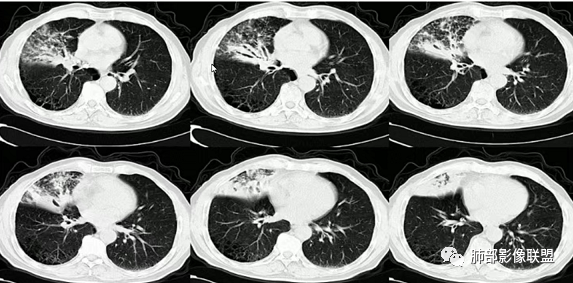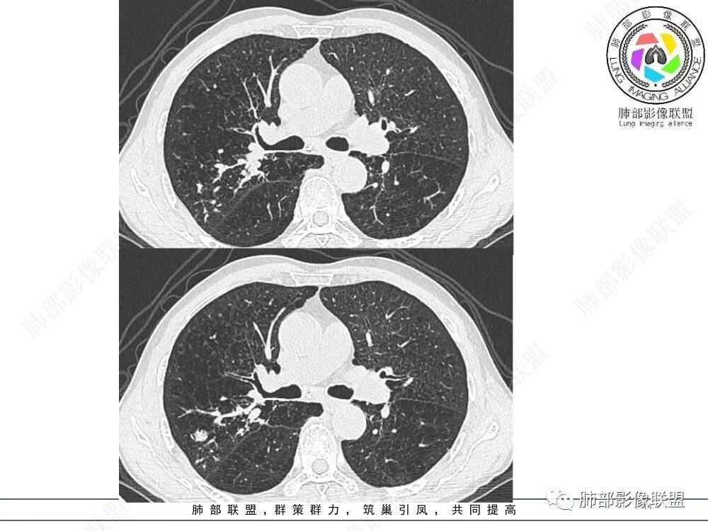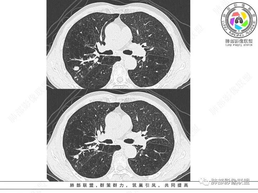 ⑤结核:多好发于上叶尖后段及下叶背段,影像呈现多灶性、多态性、新旧不等的特点,结核累及支气管黏膜及黏膜下时可见支气管内粘液栓、指套征,多伴有支气管壁增厚、支气管狭窄后扩张及树芽征、钙化等征象。本例患者无结核中毒症状,结核相关实验室检查阴性,暂不考虑。