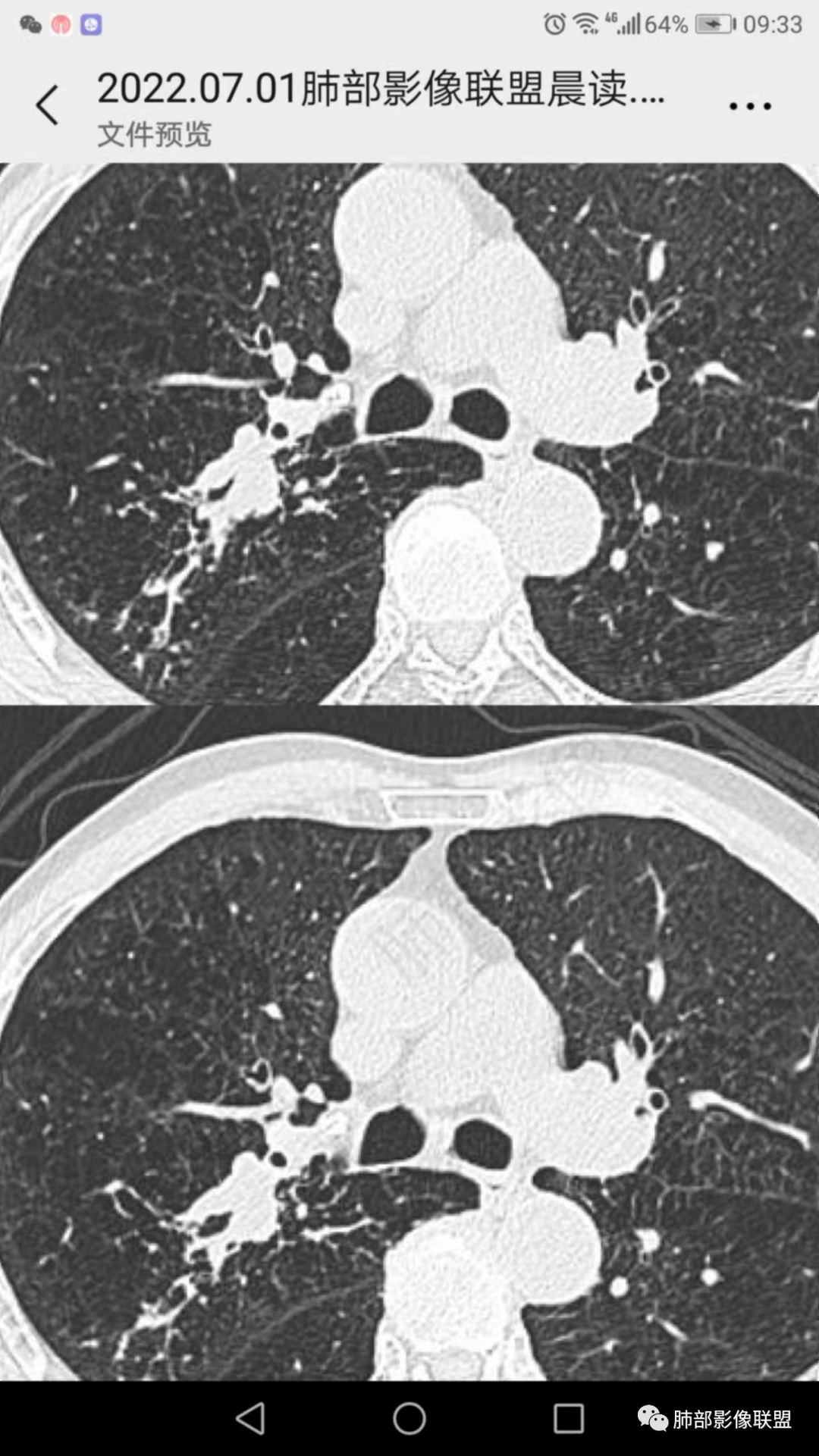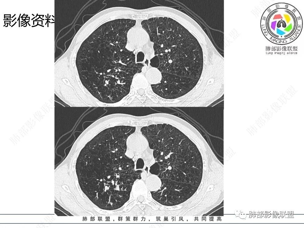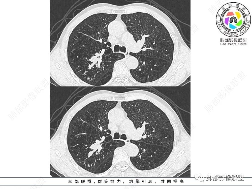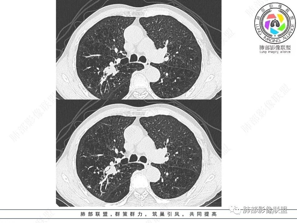 ④ABPA:ABPA是一种免疫性肺综合征,多以咳嗽咳痰及喘闷为主要临床症状,多数患者有特异性体质,对多种食物或药物过敏,实验室检查可见外周血嗜酸性粒细胞升高、血清总IGE抗体明显升高等。ABPA影像多表现为较对称分布的中心性支气管扩张、支气管腔内粘液栓(常呈指套征、牙膏样改变,部分粘液栓为高密度,较具特征性)以及肺实变、树芽征等,长期咳喘患者中出现中心性支气管扩张伴高密度粘液栓形成具有一定的特征性。支扩变化较快也是特征。本例患者无喘闷症状,实验室检查嗜酸性粒细胞无增高,暂不支持诊断。