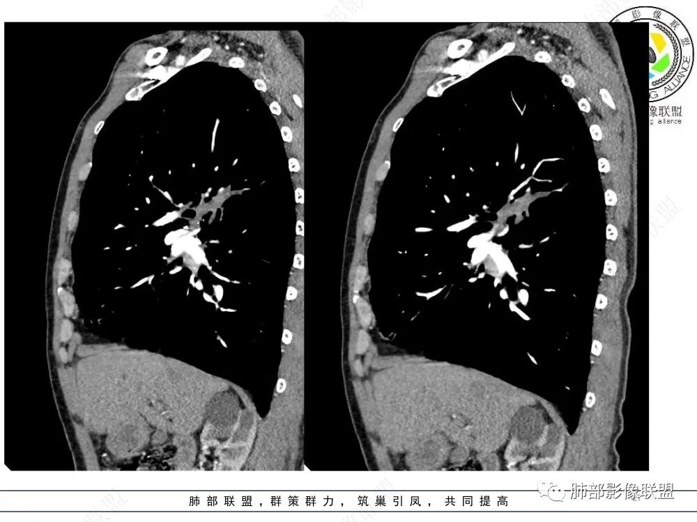 1、支气管粘液栓的表现∶多位于肺门的外侧,紧邻肺门,少数位于肺野外周,走行与正常支气管走行类似,而原来相对应区域的支气管缺失或阻塞。呈分支状或指套状结构,近端闭锁,不与支气管相通,与CT扫描层面平行时为"V"形、"Y"形或多个分支条状,与CT层面垂直时为类圆形结节状,MSCT应用MPR可行任意角度重组观察黏液栓的形态及其与近端支气管、血管的关系。黏液栓多为水样密度或软组织密度(较粘稠的黏液).但增强扫描无强化;内可有气体影,形成液气平面。伴随肺动脉细小。