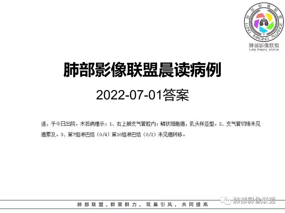 综上,本例考虑恶性肿瘤性病变,以鳞癌可能性大,亦不除外小细胞肺癌、粘液表皮样癌等,另外还需密切结合病史排除异物等病变可能。