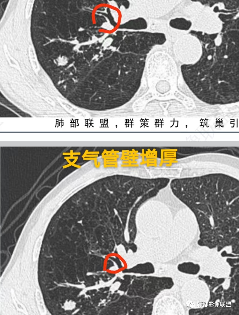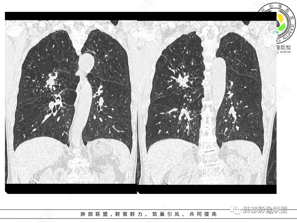 上图,ABPA,支气管扩张、腔内指套样粘液栓,部分粘液栓呈高密度,较具特征性。