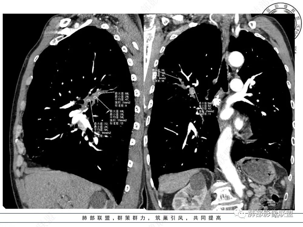 ABPA影像:1、中心型支气管扩张,常常双侧较对称,一般以段、亚段为主,支气管壁增厚,腔内有粘液栓,呈指套状或牙膏状影,粘液栓高密度(约30%),无强化。2、小气道异常∶小叶中心细支气管扩张并充有粘液——树芽征。3、伴随征象∶肺内斑片状、结节状高密度影,呈游走性;扩张支气管远端可伴有阻塞性肺气肿、肺不张,肺纤维化、局部胸膜增厚或积液。4、治疗好转粘液栓消失,扩张支气管的转归∶ 部分不变化,部分较前稍缩小,很少一部分可以恢复正常,一般壁稍增厚。