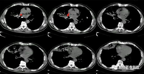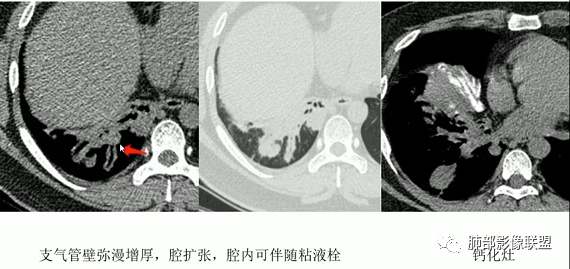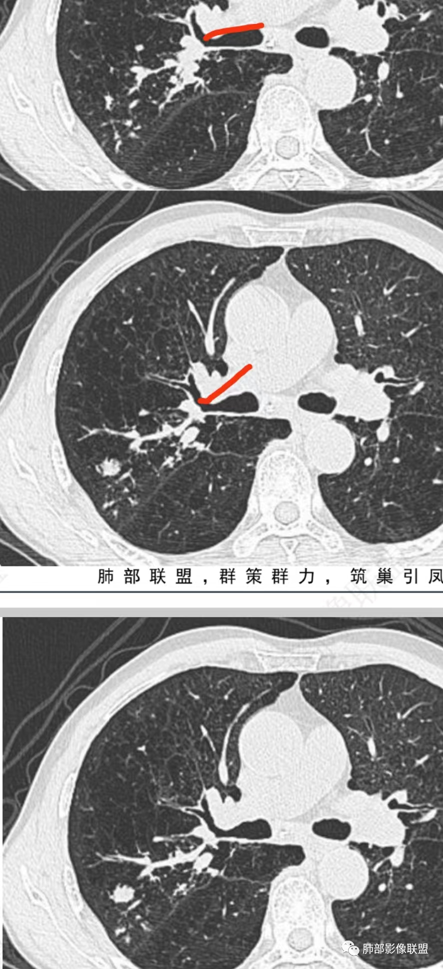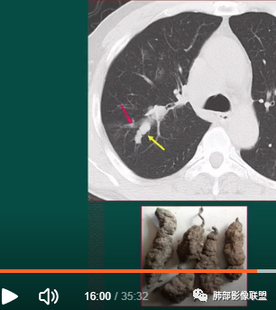 上图,支气管结石(红箭头),远端阻塞性炎症,腔内粘液栓。