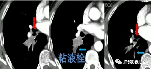 根据支气管腔内病变强化情况去判断:1、腔内病灶强化—肿瘤性病变∶ 鳞癌、小细胞癌、类癌等;2、腔内病灶不强化—粘液栓(非肿瘤性病变)∶支气管闭锁. 结核、真菌、异物等。