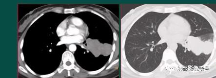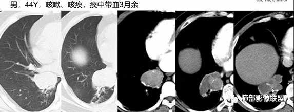 上图,小细胞肺癌,病灶从肺门朝外沿支气管爬行,呈指套样改变,病灶周围阻塞性肺炎较轻。