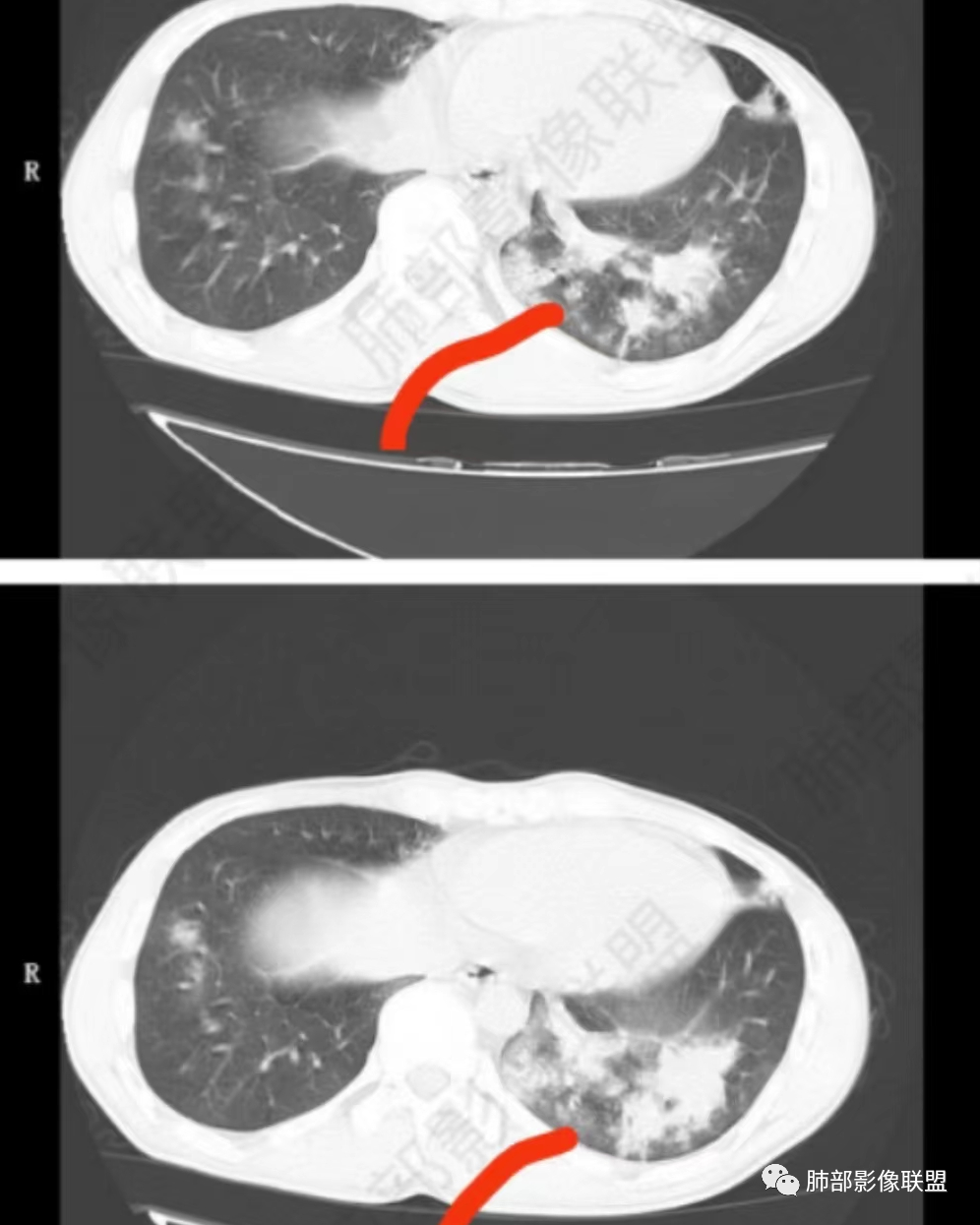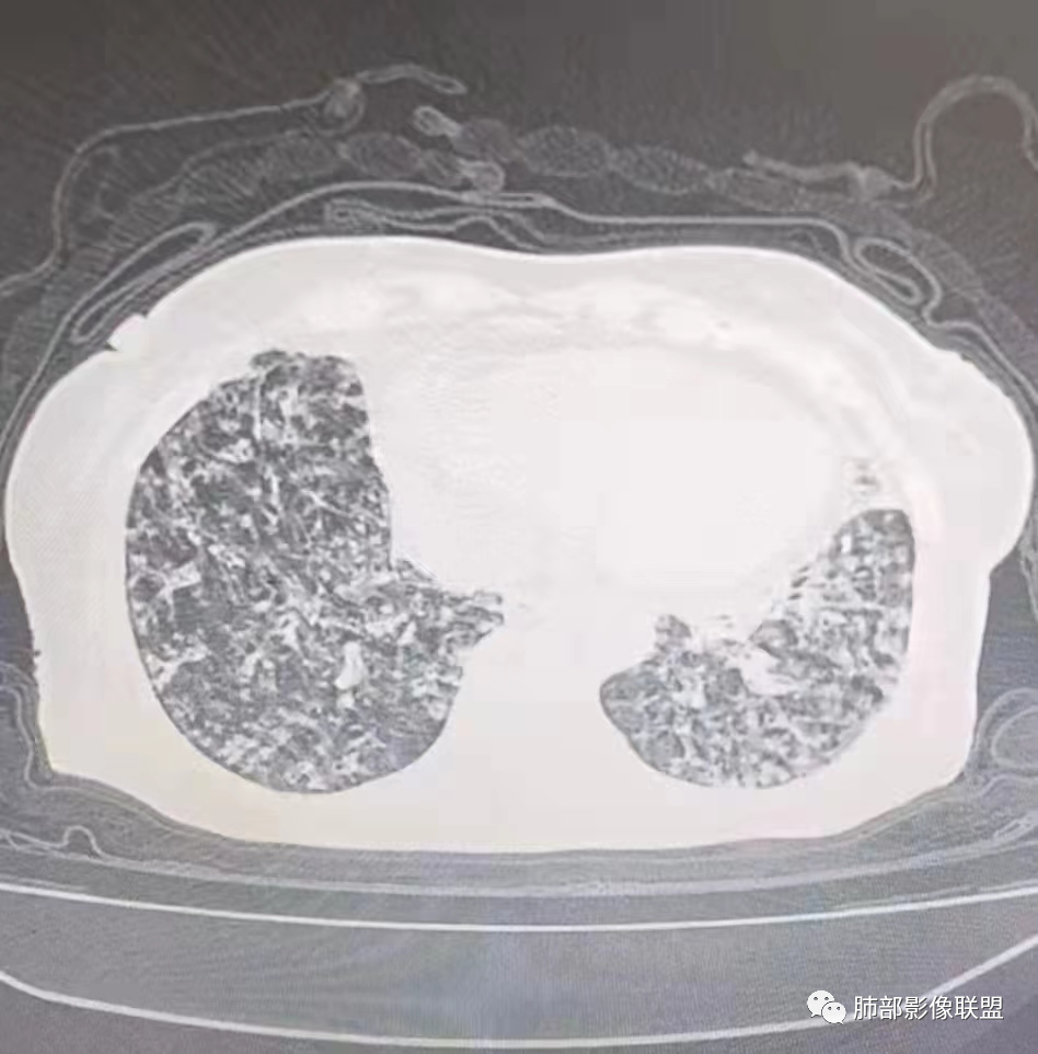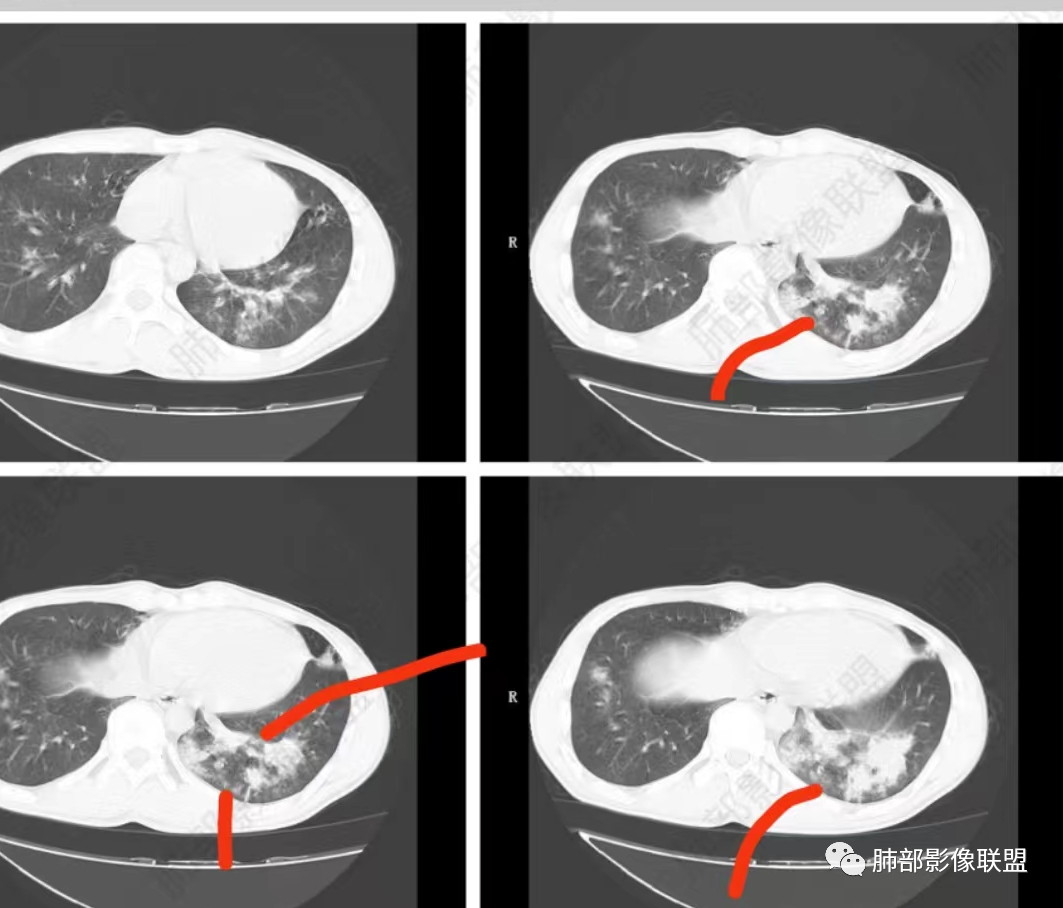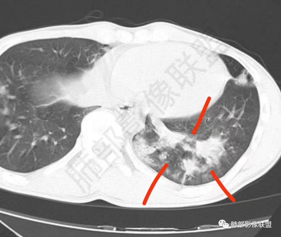 2)病灶密度较均匀柔和,边界不清,没有树芽征,没有新旧不等,病情反复,吸收变化较快,显然不符合结核或非结核分枝杆菌感染。