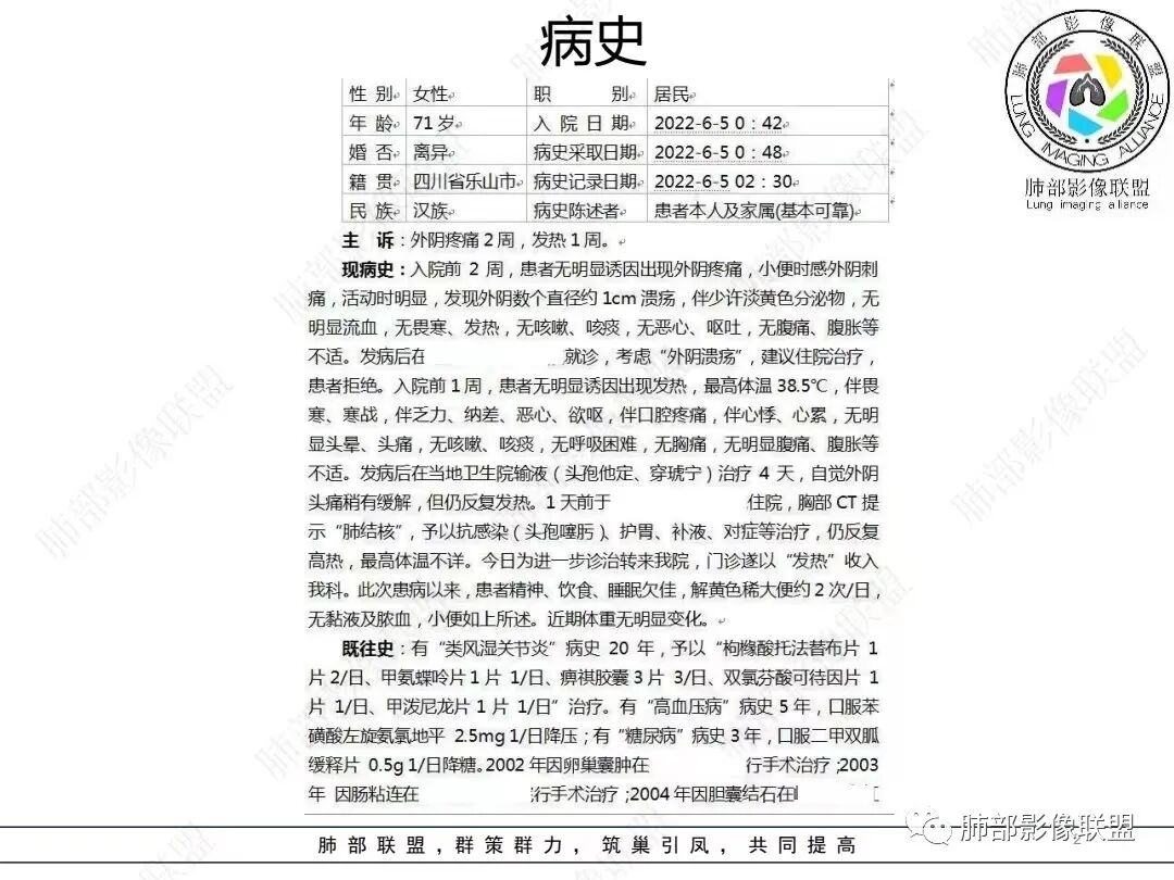 女,71,外阴疼痛2周,发热1周。类风关、高血压、高血糖、卵巢囊肿、肠粘连、胆囊结石等病史及相关药物治疗史。胸部CT:两肺弥漫磨玻璃,血管束增粗,两下肺后肋膈角多发蜂窝,对称分布,双侧胸腔少量积液,纵隔窗心脏大血管影明显增宽。考虑混合性病变,CTD-ILD,并肺水肿?并PJP?。