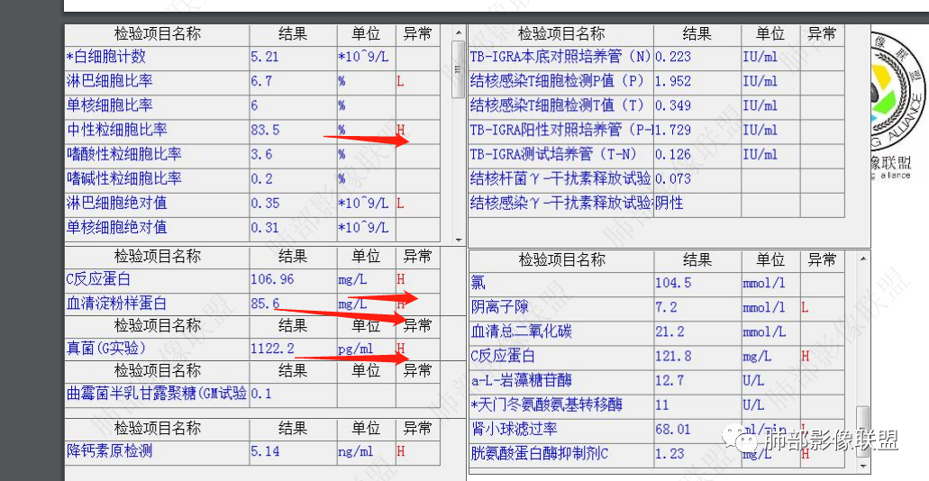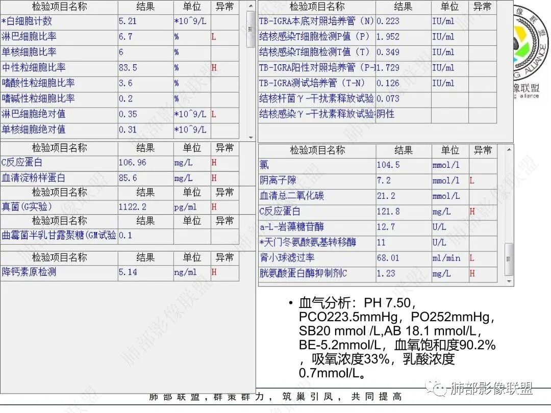 实验室白细胞不高,C反应蛋白、PCT增高,淋巴细胞显著低(CD4项阙如),G试验值相当高。肾小球滤过率降低,呼衰等等。