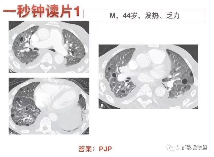 肺部影像联盟晨读病例有类风湿肺病史,影像蝶翼状磨玻璃影,伴散在结节、双侧胸水,考虑PJP。