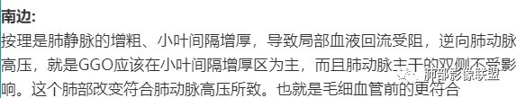 @南边?有一个疑问,你说:按理是肺静脉的增粗、小叶间隔增厚,导致局部血液回流受阻,逆向肺动脉高压,就是GGO应该在小叶间隔增厚区为主