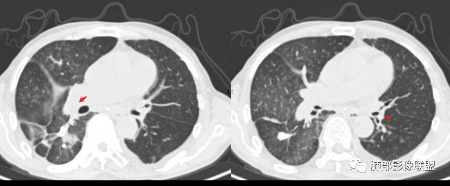 如果这个树芽征明确的话,这个就不是肺水肿。可以做个最大密度投影或多方位观察再次确定是否有树芽征。弥漫性中轴间质和周围间质增厚常规就两个疾病谱,癌淋或肺水肿。而且这个人有明确的右肺明显。结合可疑树芽征,很多可以看到沿着肺动脉走形的磨玻璃影,需要可疑血源播散性转移或血管源性恶性肿瘤病变,再就是嗜血管的淋巴源性的恶性肿瘤。血管肉瘤,血管内淋巴瘤病可以这个表现,之前还碰见过一个,好像是NK/T淋巴瘤也这个表现,这个有点记不清了。