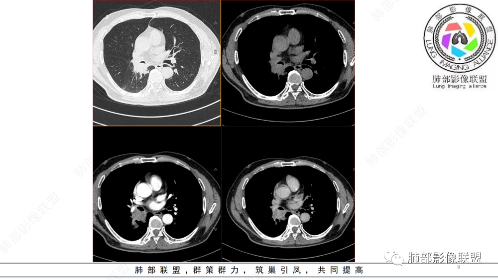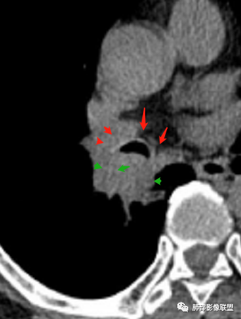 气管截断,血管破坏,跨壁内外生长,阻塞性炎症,定性恶性,明显强化,首先考虑类癌,鉴别鳞癌