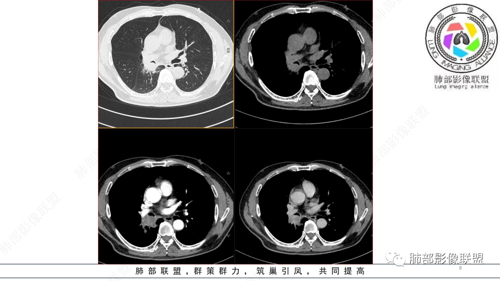 6、与其他低分化肺癌一样,鳞癌的坏死比较明显,主要特点是早、多发、范围大、易融合、易形成空洞。纵隔窗增强扫描是显示坏死的关键。