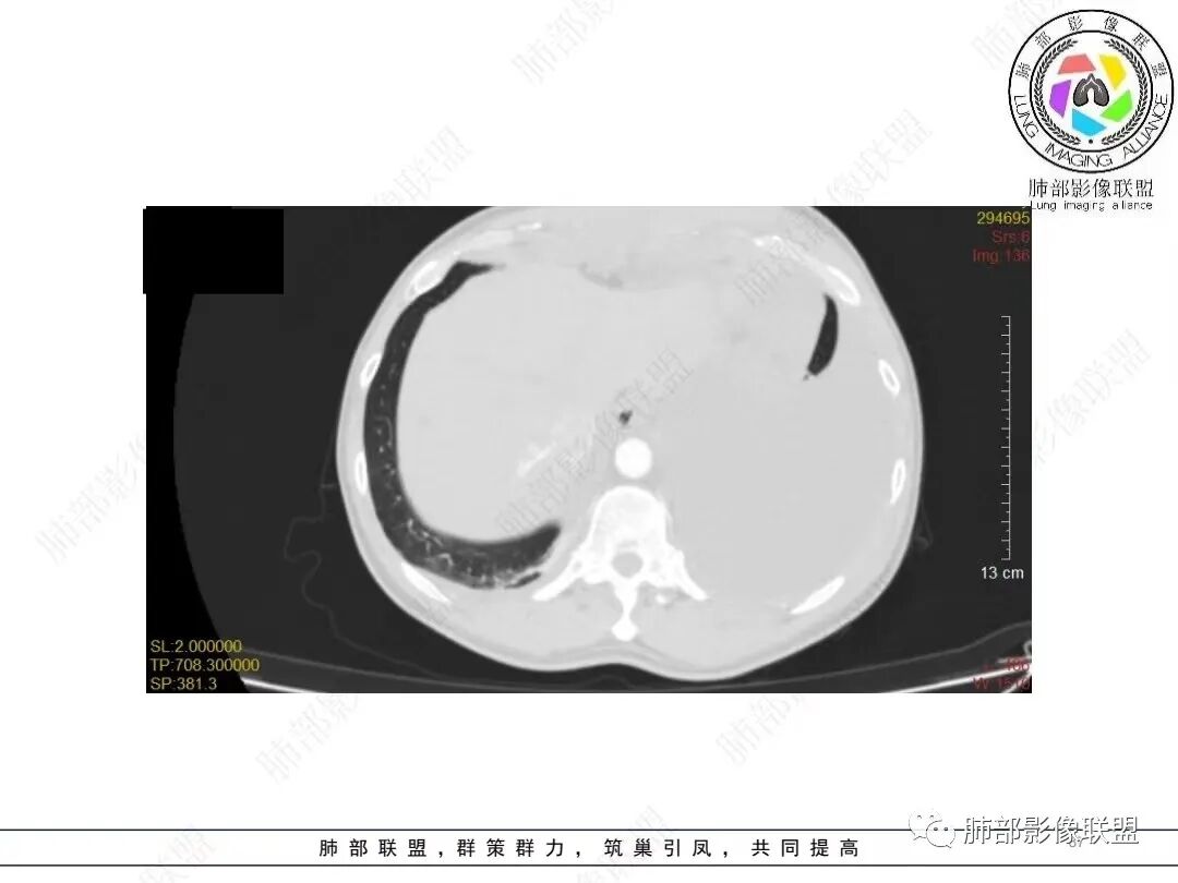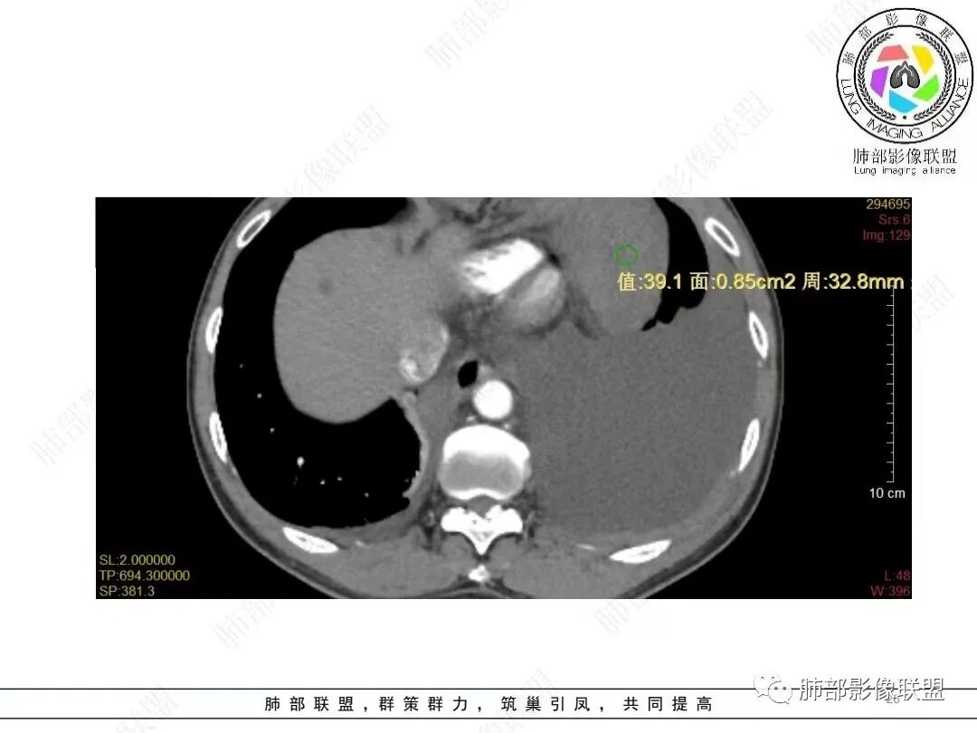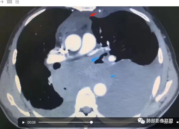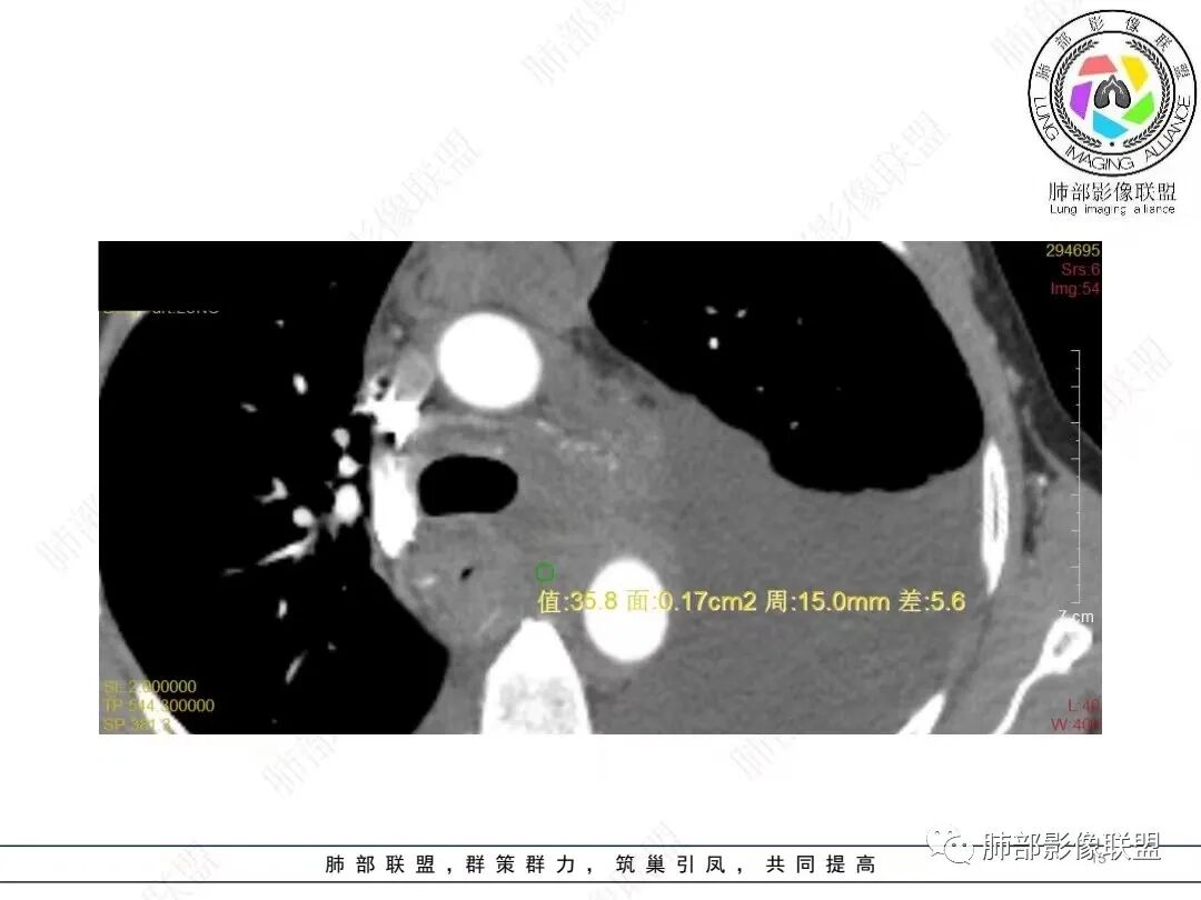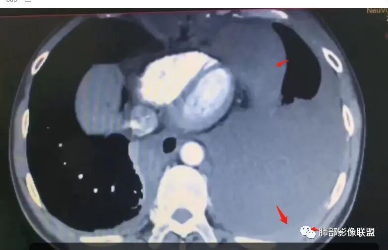 我把这个征象给忽略了,感觉很奇怪的病例。事后诸葛亮一下。这里的弥漫性,连续性增厚,有点特异性,还是要考虑到恶性间皮瘤的可能性的。胸膜转移瘤,不会这么连续性的不规则增厚。食管管腔是存在的,而且是推移明显,食管来源的话这种表现的最常见就是平滑肌瘤,不太符合。另外用小细胞解释腹腔病变感觉有点牵强,而且食管推移这么的明显,用淋巴瘤不好解释左心膈脚的这个软组织。没公布答案的时候,我一直在拿不准它到底是个啥。