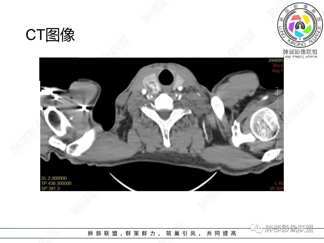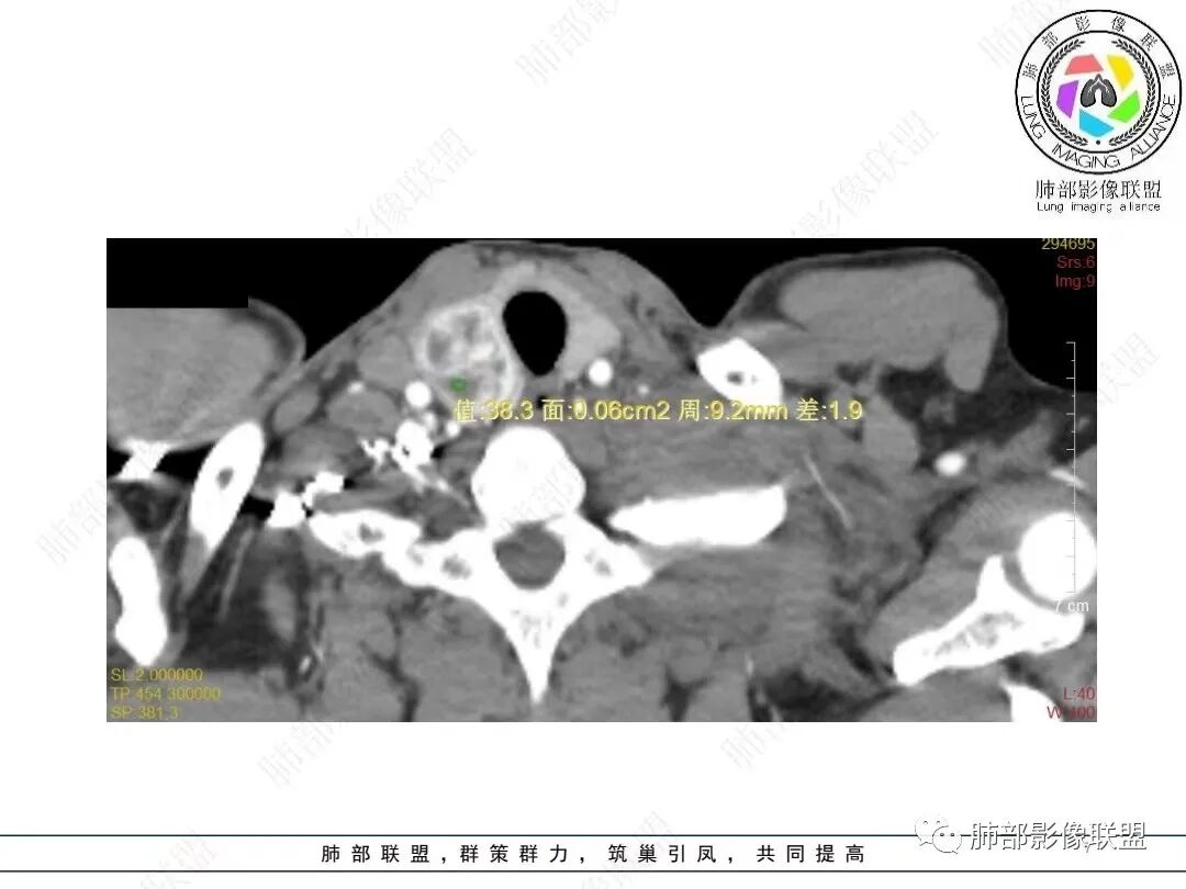 就胸部病灶的特性,好像与甲状腺的不一致。强化、内部的坏死囊变不相符。我认为甲状腺来源的几率不高。