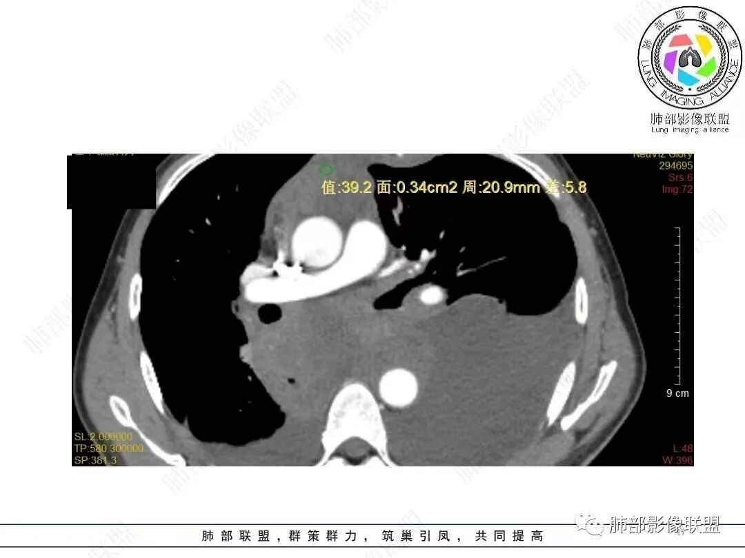淋巴瘤需要鉴别,纵隔淋巴瘤好发中纵隔、密度较均匀、增强后轻中度强化,净增值<30HU,也少见胸膜及心包结节。