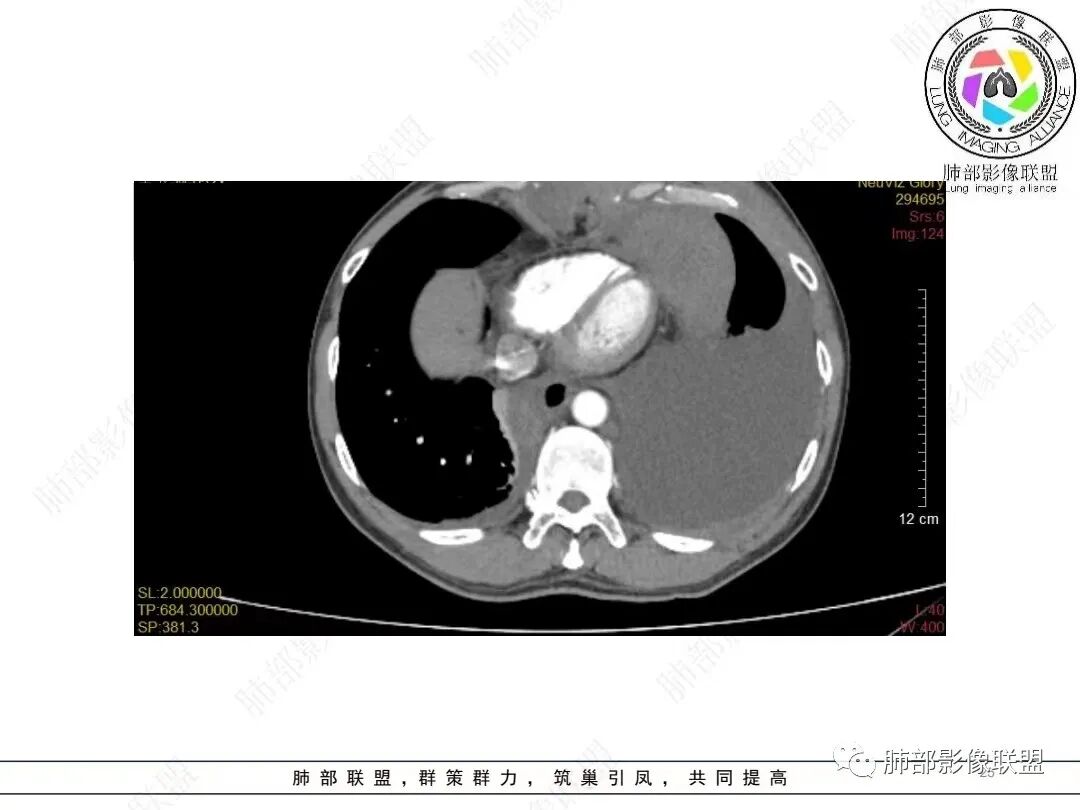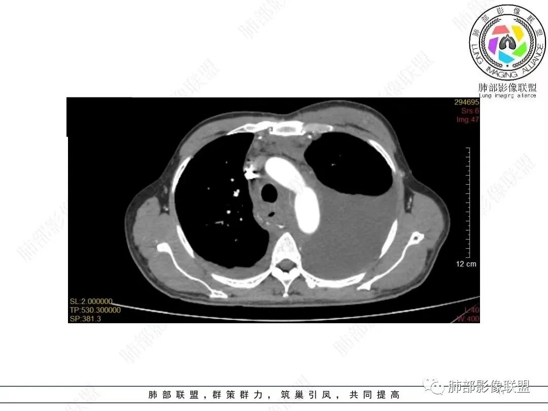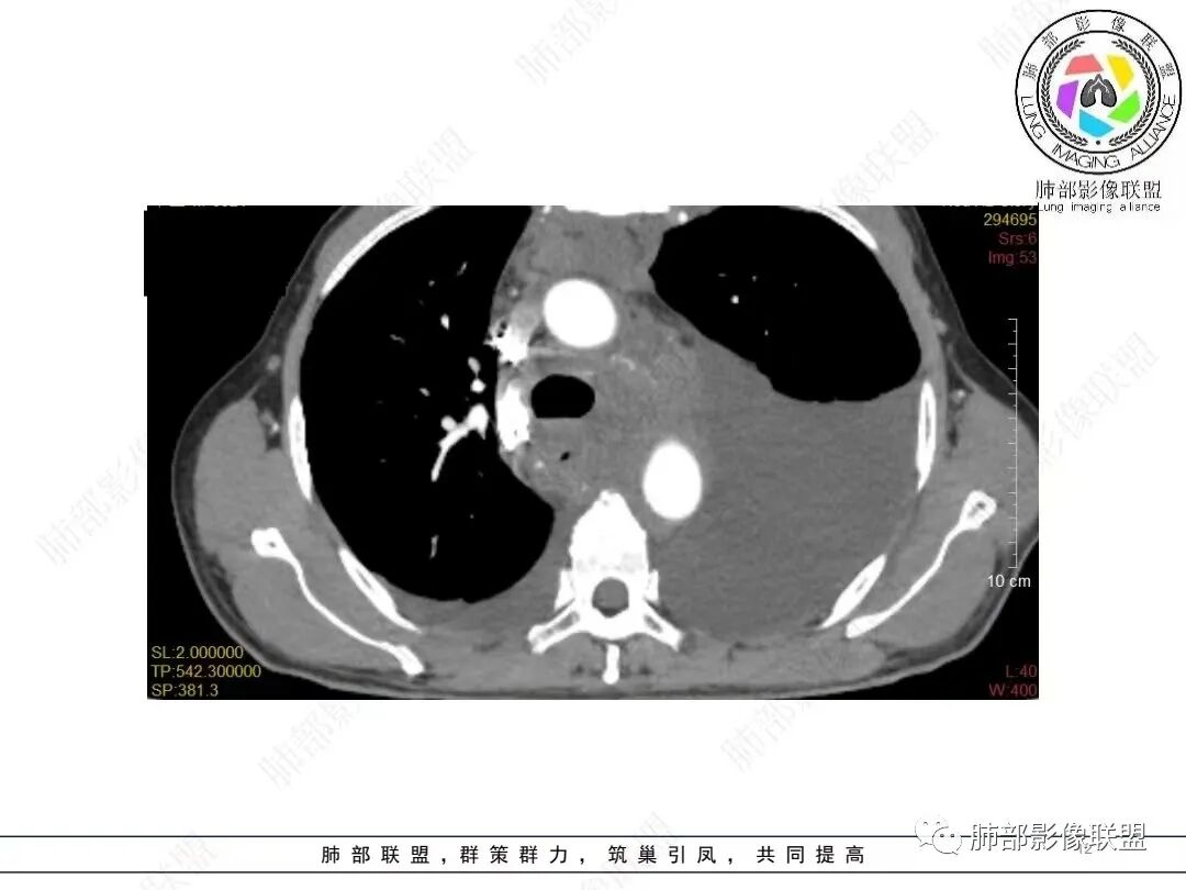 2.影像学特点:病变范围相当广泛,多发块状影累及纵隔、胸膜、前胸壁(胸大肌下)、前上腹壁等。胸膜弥漫性斑状增厚为主,明显强化,纵隔旁椭圆形块影较密实,沿胸膜分布趋势,未见支气管等结构进入。后纵隔块影较大,占位效应明显,肺静脉受累狭窄。双侧胸腔积液。