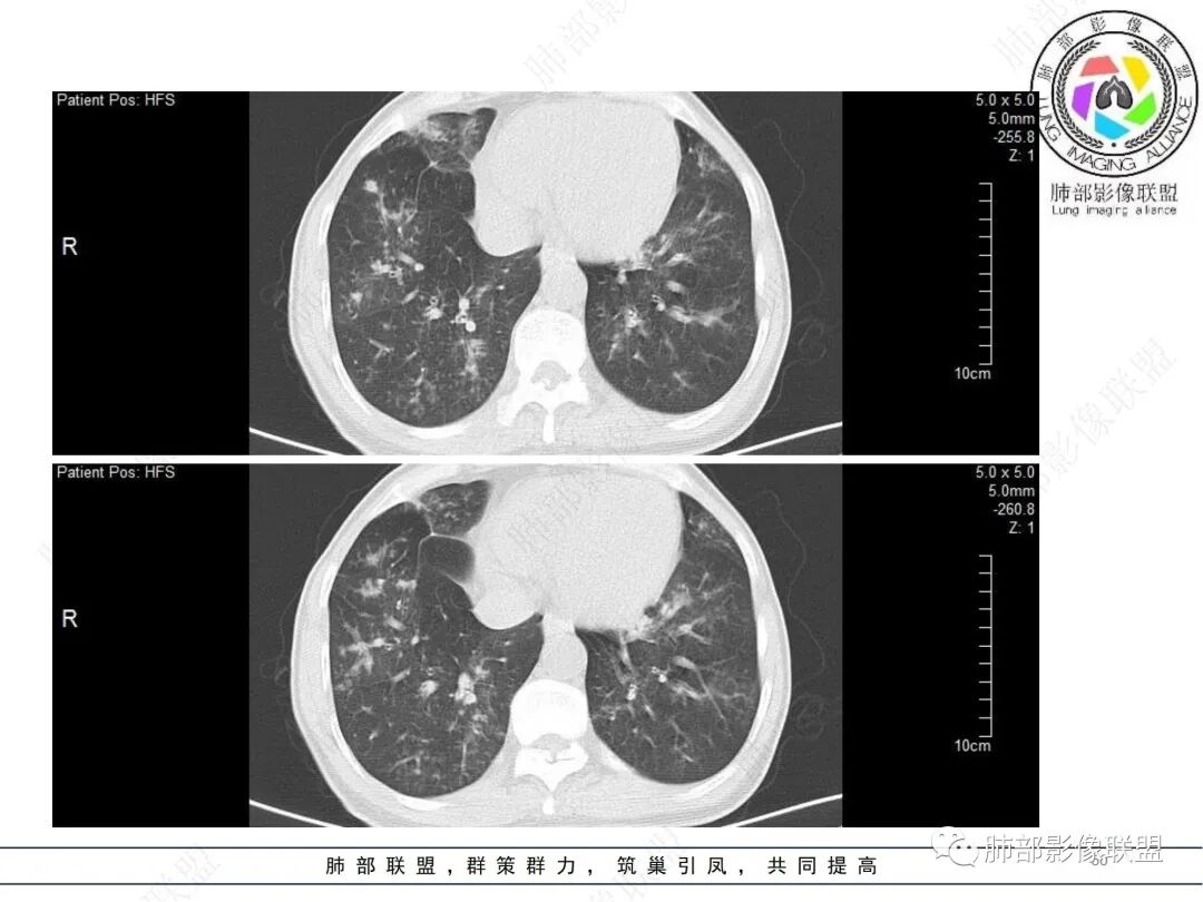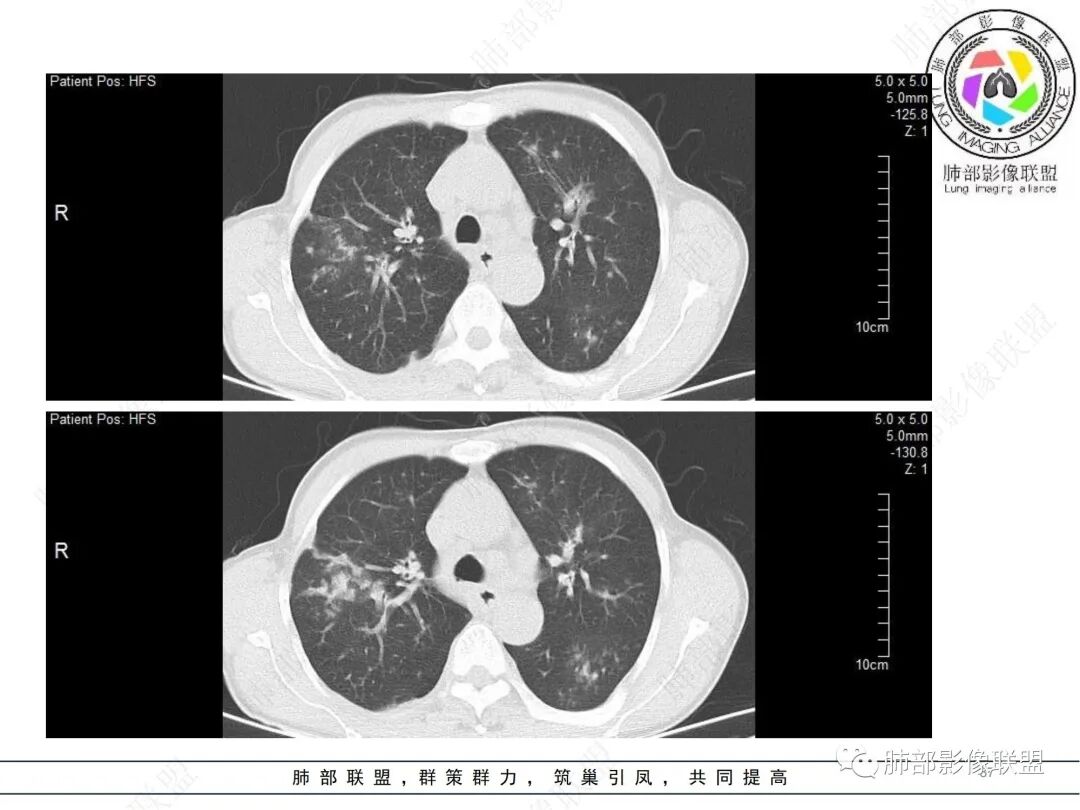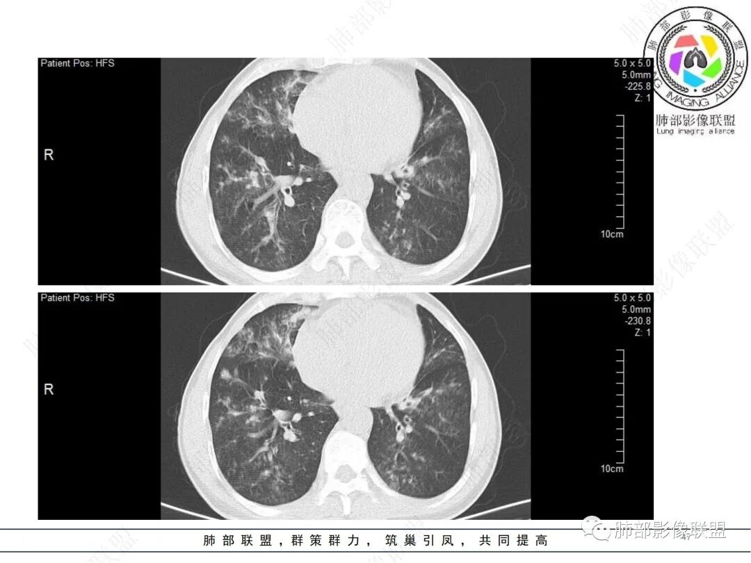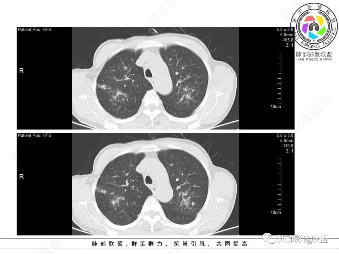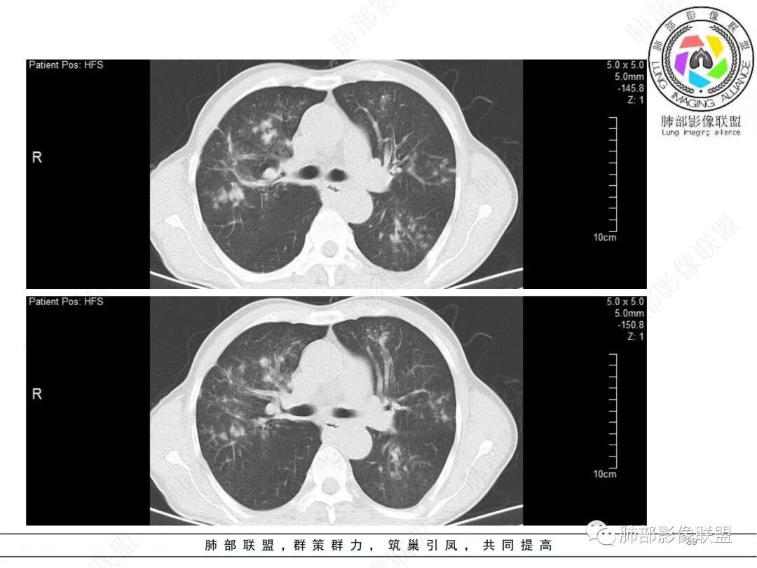 2022.6.24CT显示两肺弥漫性段、亚段支气管壁增厚(两肺各叶都累及),增厚的支气管壁外可见沿着支气管分布的渗出、实变影。另外远端肺内亦可见多发树芽影、结节影,其边界欠清晰。右肺下叶基底段局部胸膜下亦可见小斑片影,边界不清。2022.6.27CT显示两肺增厚的支气管壁外的渗出实变影明显增多、范围更广。远端肺内病灶亦增多、范围增大。部分位于胸膜下的病灶可见侧向融合趋势。3.病例分析: