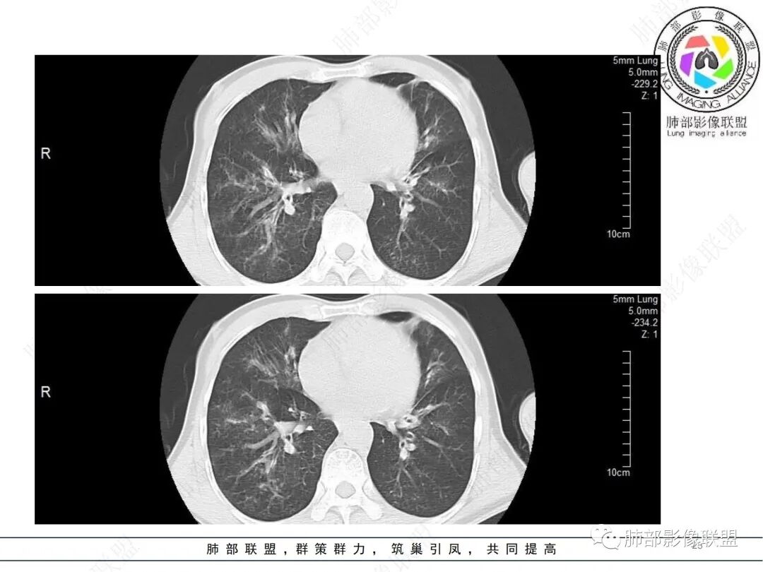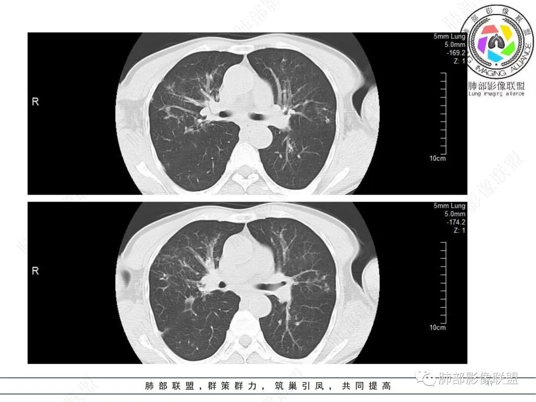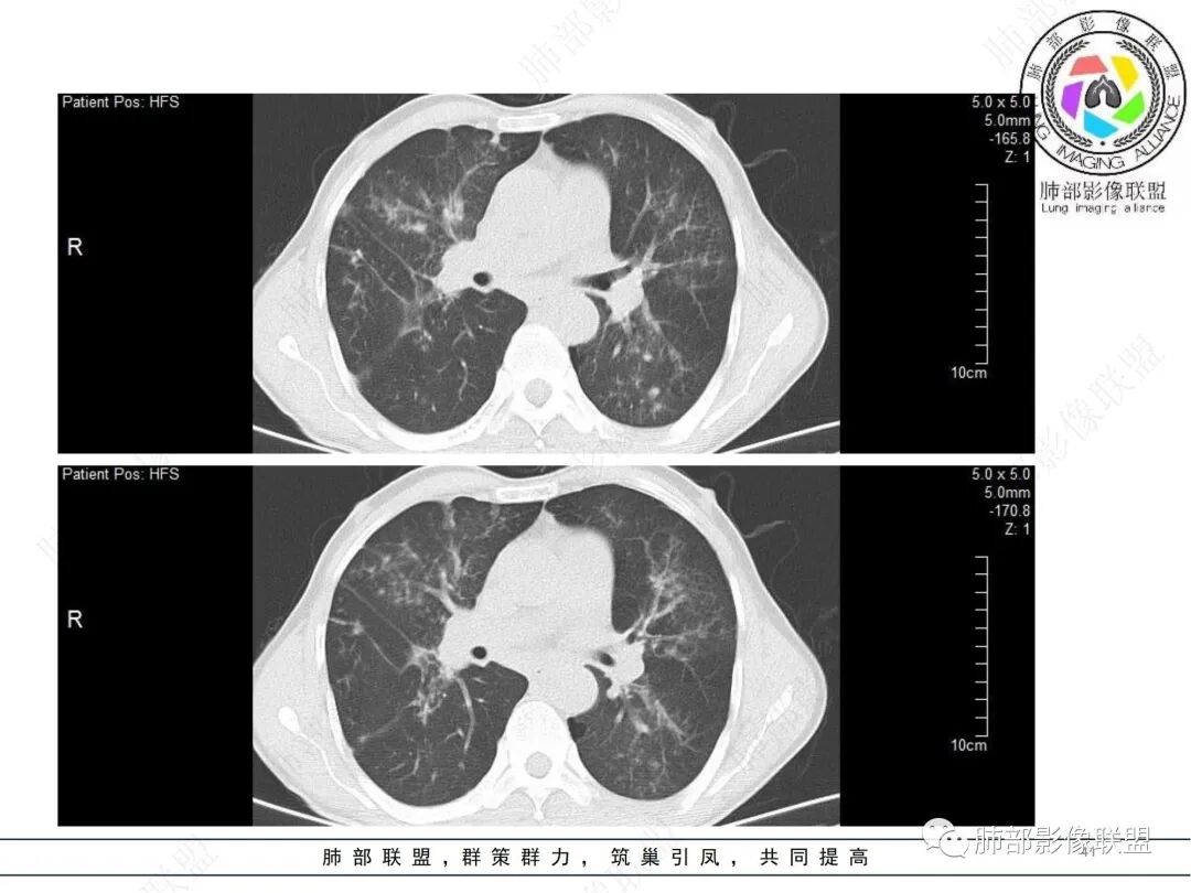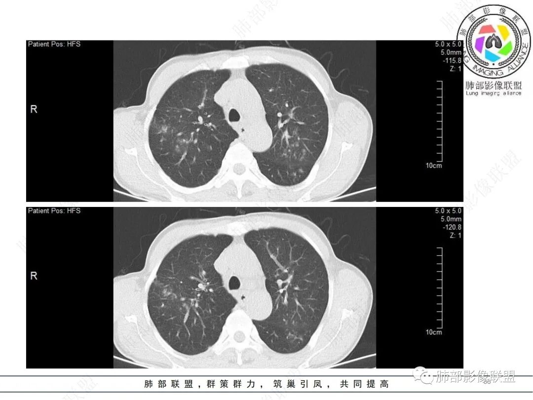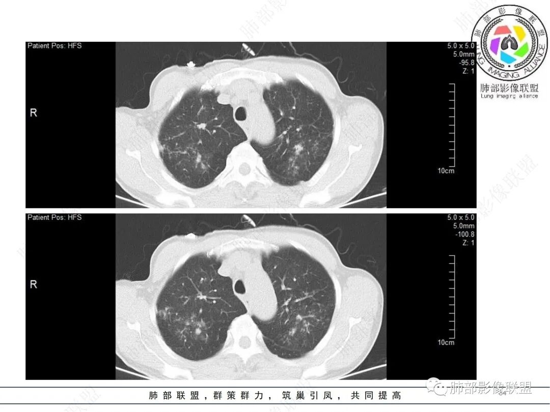 2022.6.24CT显示两肺弥漫性段、亚段支气管壁增厚(两肺各叶都累及),增厚的支气管壁外可见沿着支气管分布的渗出、实变影。另外远端肺内亦可见多发树芽影、结节影,其边界欠清晰。右肺下叶基底段局部胸膜下亦可见小斑片影,边界不清。2022.6.27CT显示两肺增厚的支气管壁外的渗出实变影明显增多、范围更广。远端肺内病灶亦增多、范围增大。部分位于胸膜下的病灶可见侧向融合趋势。3.病例分析: