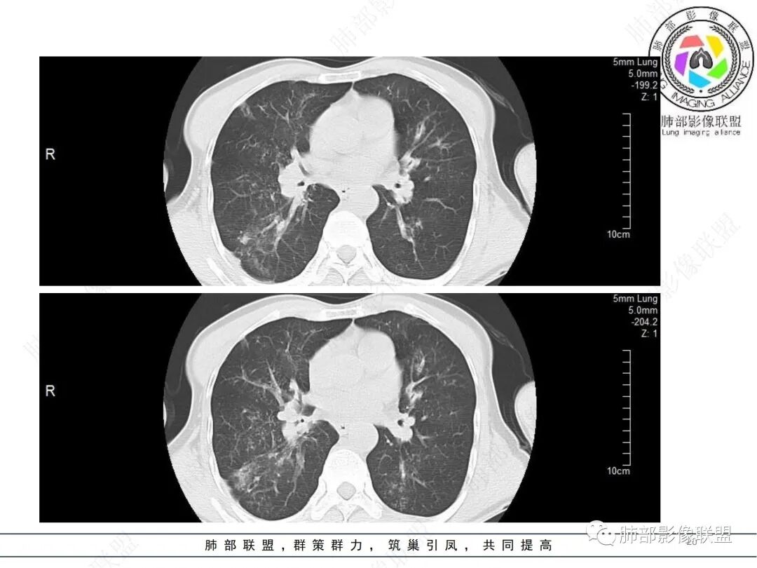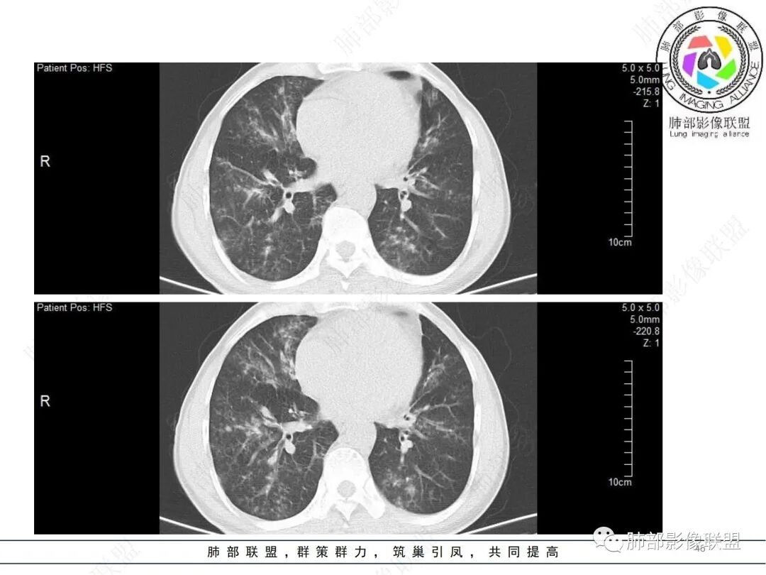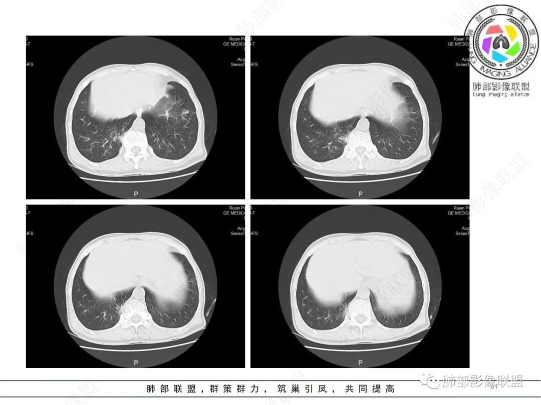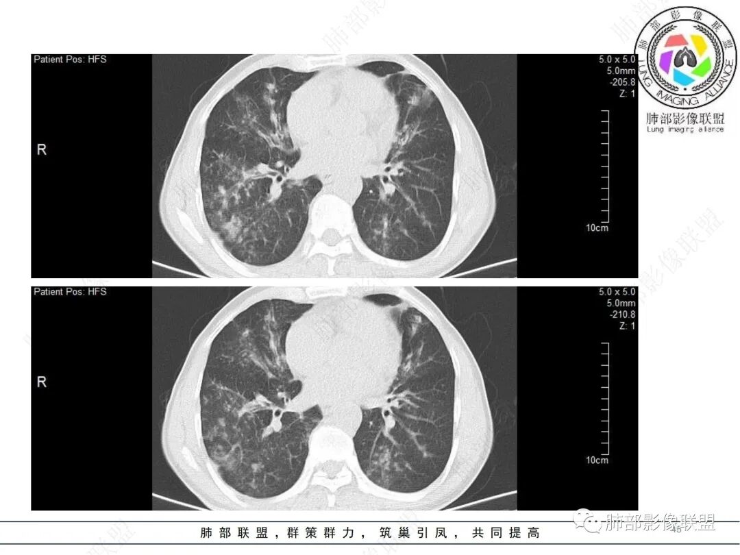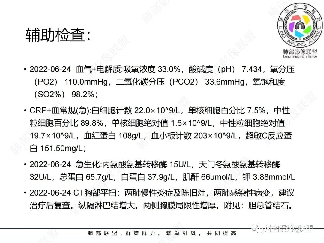 2022.6.24CT显示两肺弥漫性段、亚段支气管壁增厚(两肺各叶都累及),增厚的支气管壁外可见沿着支气管分布的渗出、实变影。另外远端肺内亦可见多发树芽影、结节影,其边界欠清晰。右肺下叶基底段局部胸膜下亦可见小斑片影,边界不清。2022.6.27CT显示两肺增厚的支气管壁外的渗出实变影明显增多、范围更广。远端肺内病灶亦增多、范围增大。部分位于胸膜下的病灶可见侧向融合趋势。3.病例分析: