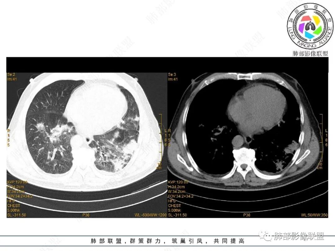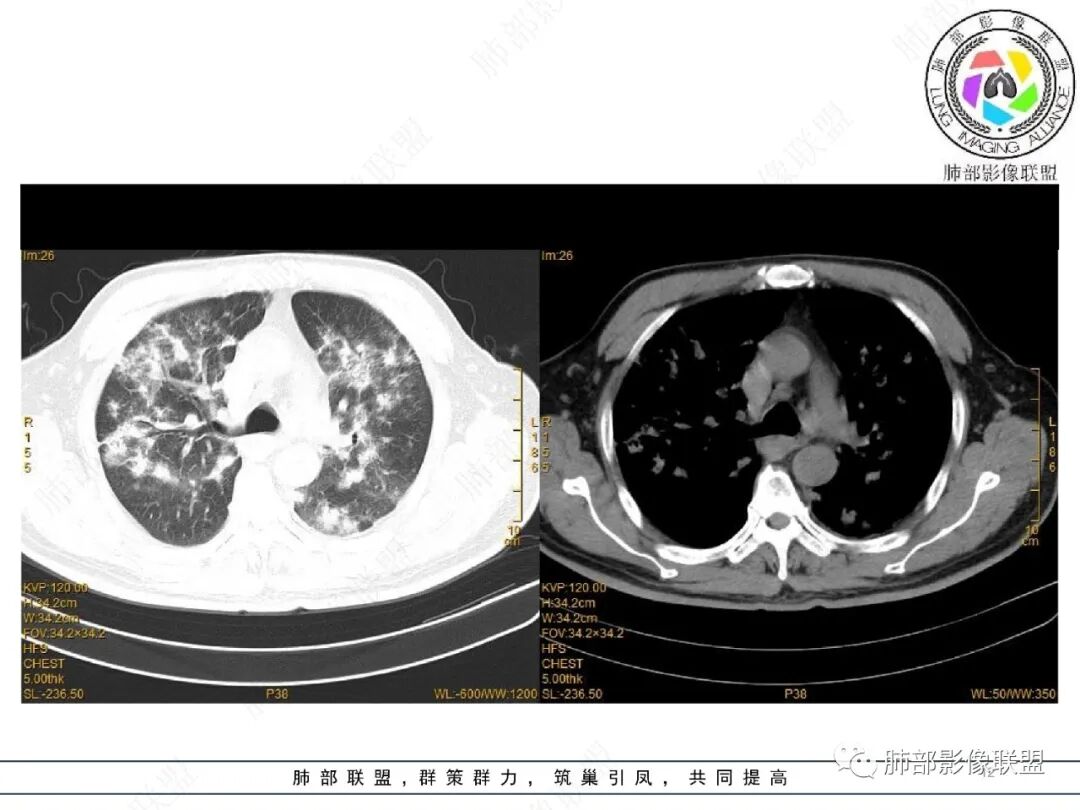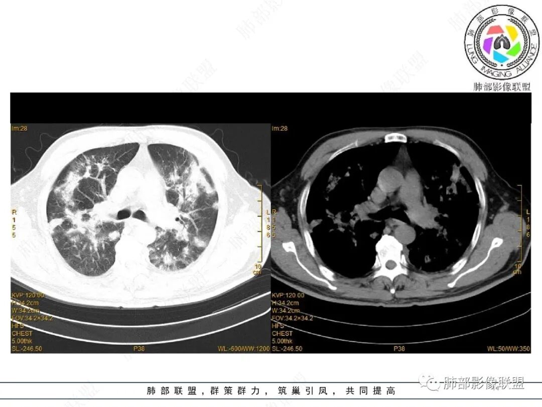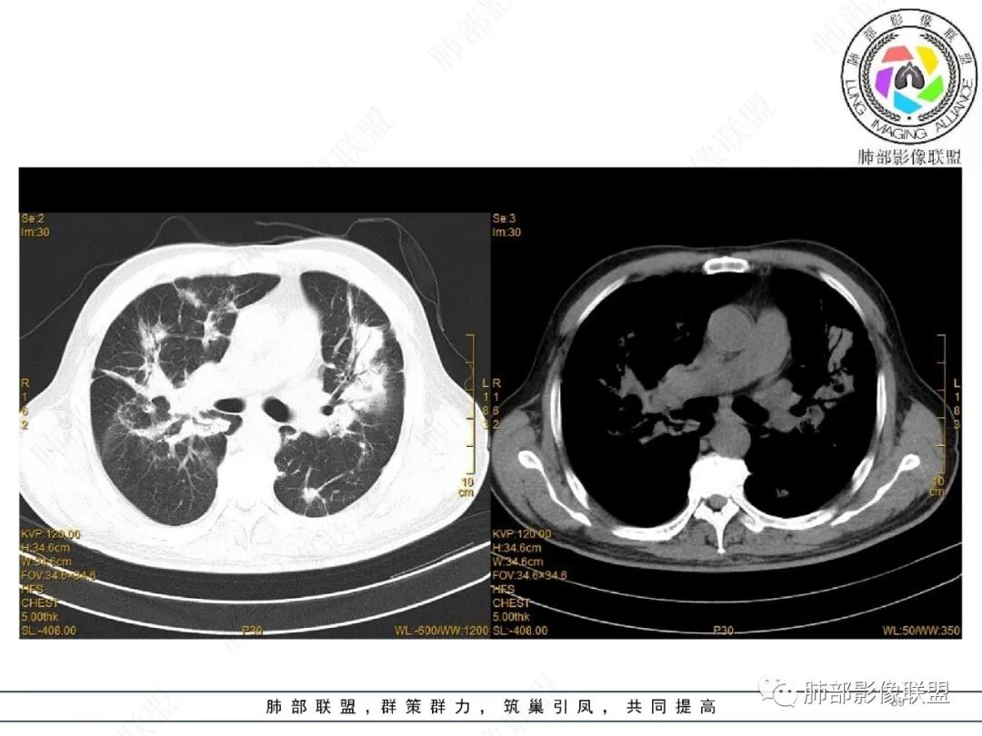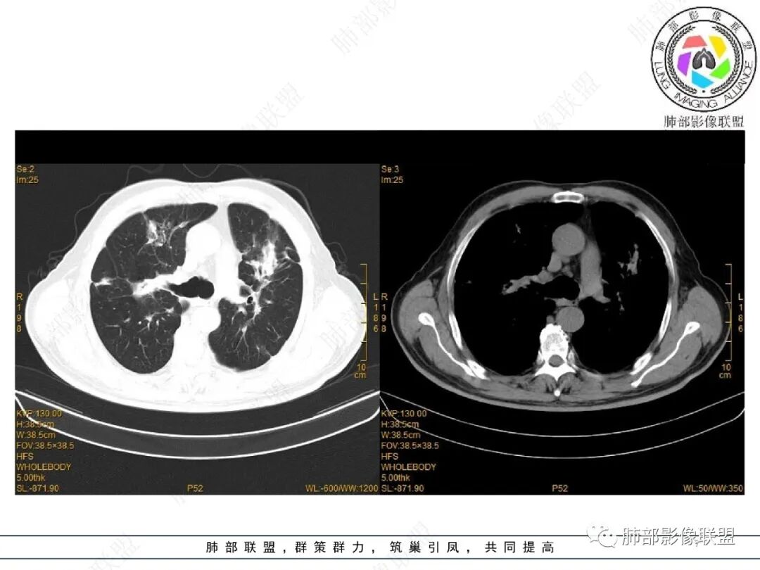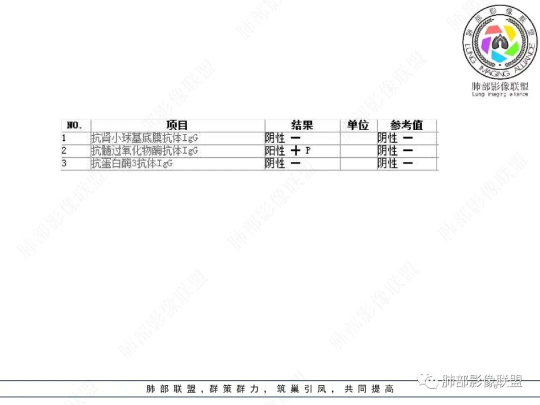 王静 安阳地区医院CT: 双肺弥漫性实变,沿着支气管血管束分布,中内带为主。患者临床症状轻,影像重,实验室检查白细胞,中性粒高,支持合并感染。抗MPO抗体阳性。支持ANCA相关性血管炎合并肺部出血可能,支持MPA