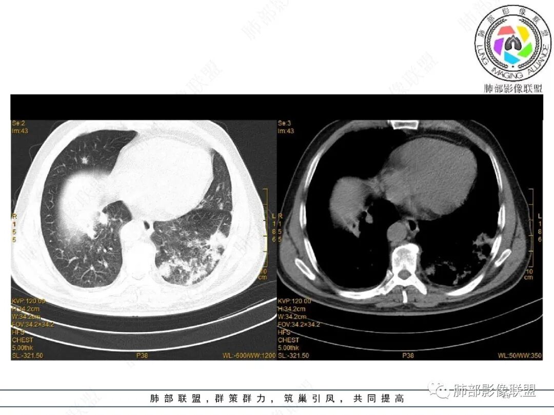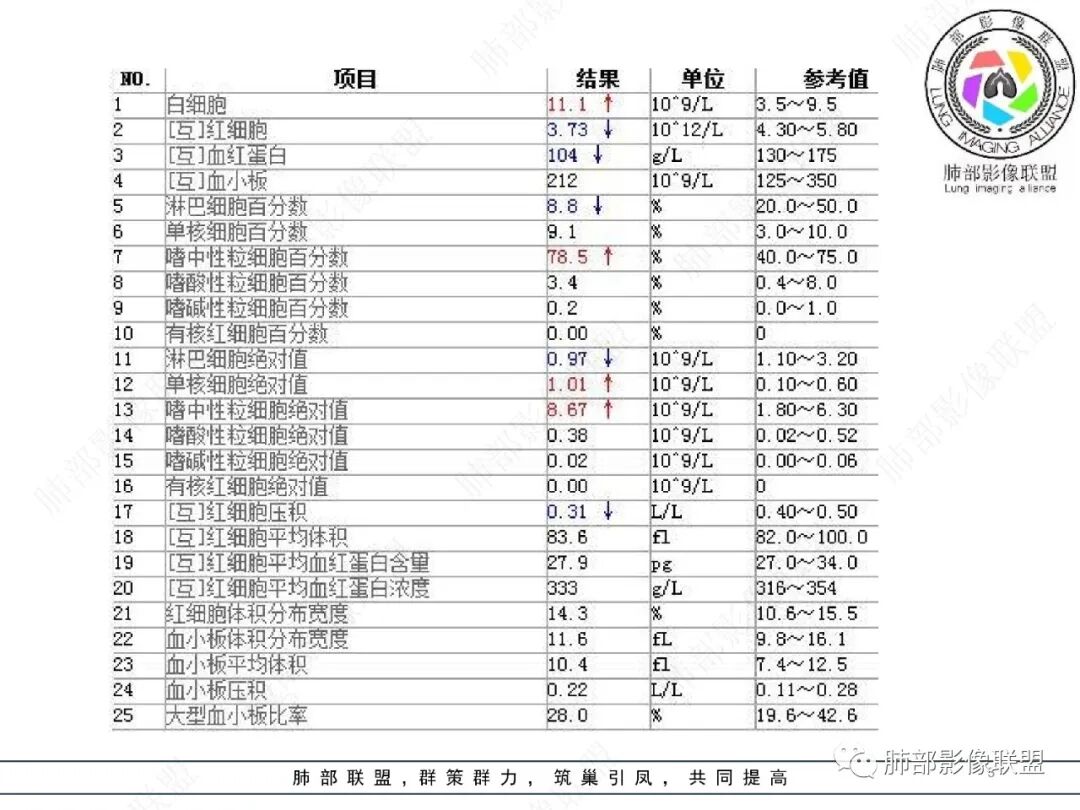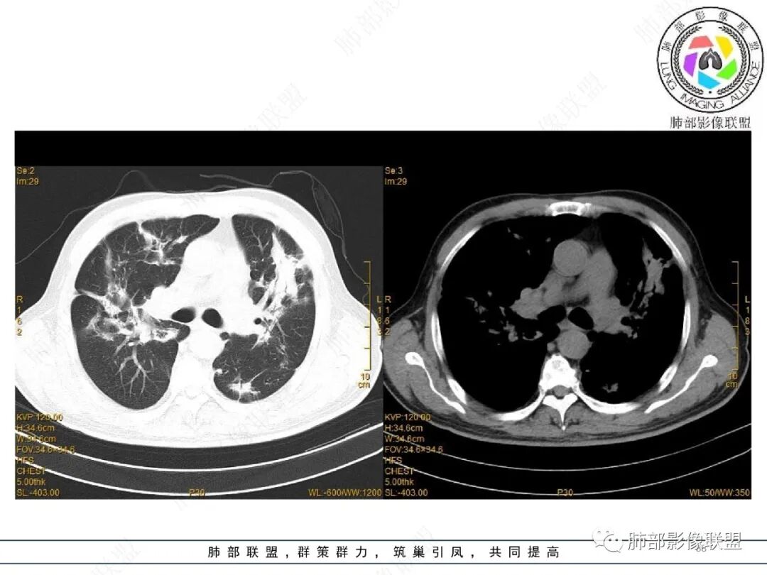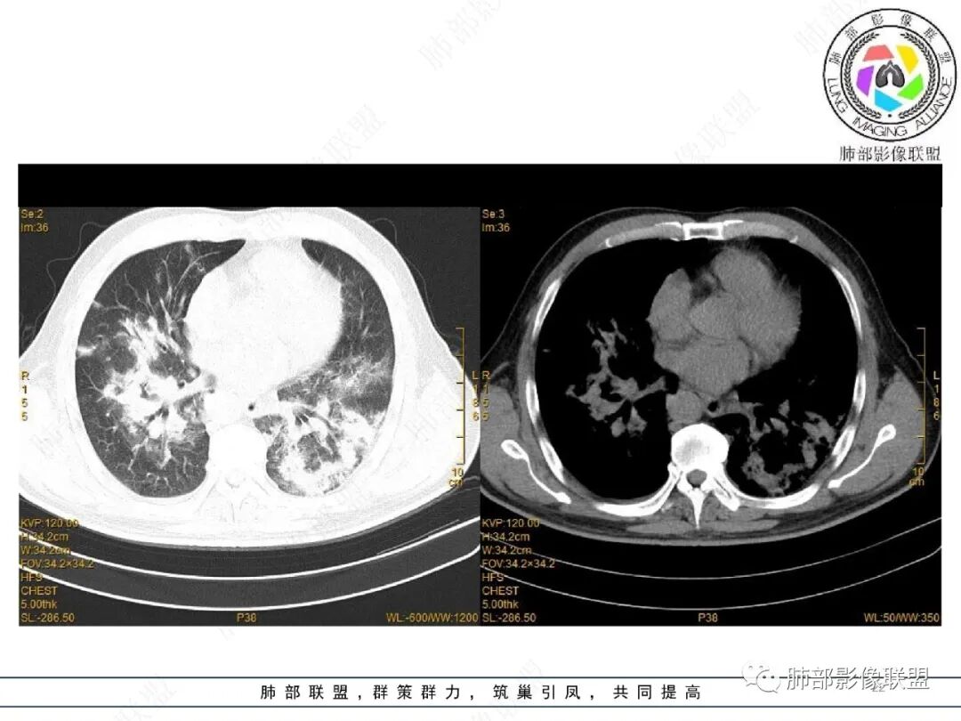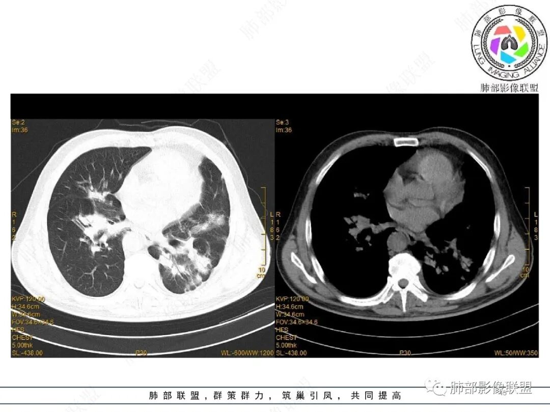 王静 安阳地区医院CT: 双肺弥漫性实变,沿着支气管血管束分布,中内带为主。患者临床症状轻,影像重,实验室检查白细胞,中性粒高,支持合并感染。抗MPO抗体阳性。支持ANCA相关性血管炎合并肺部出血可能,支持MPA