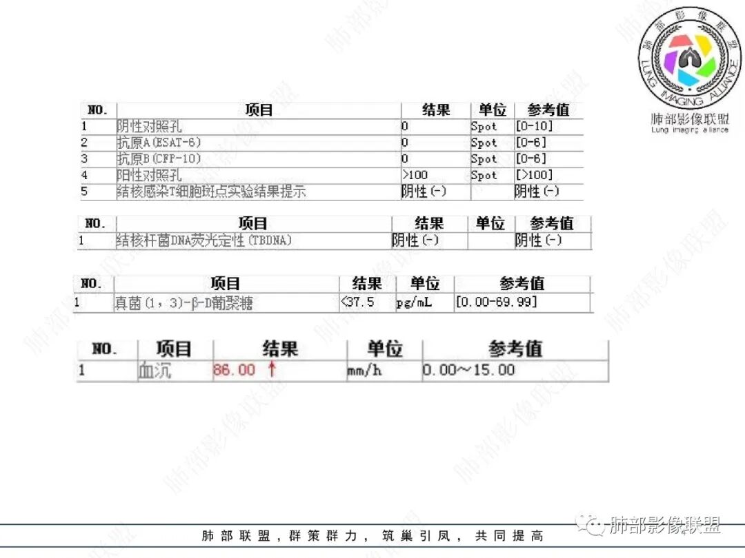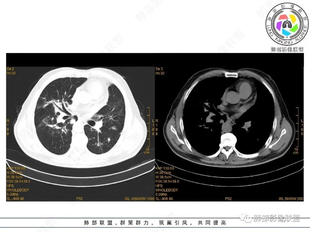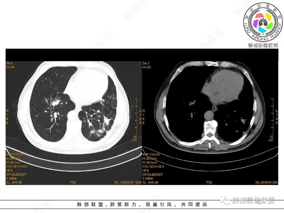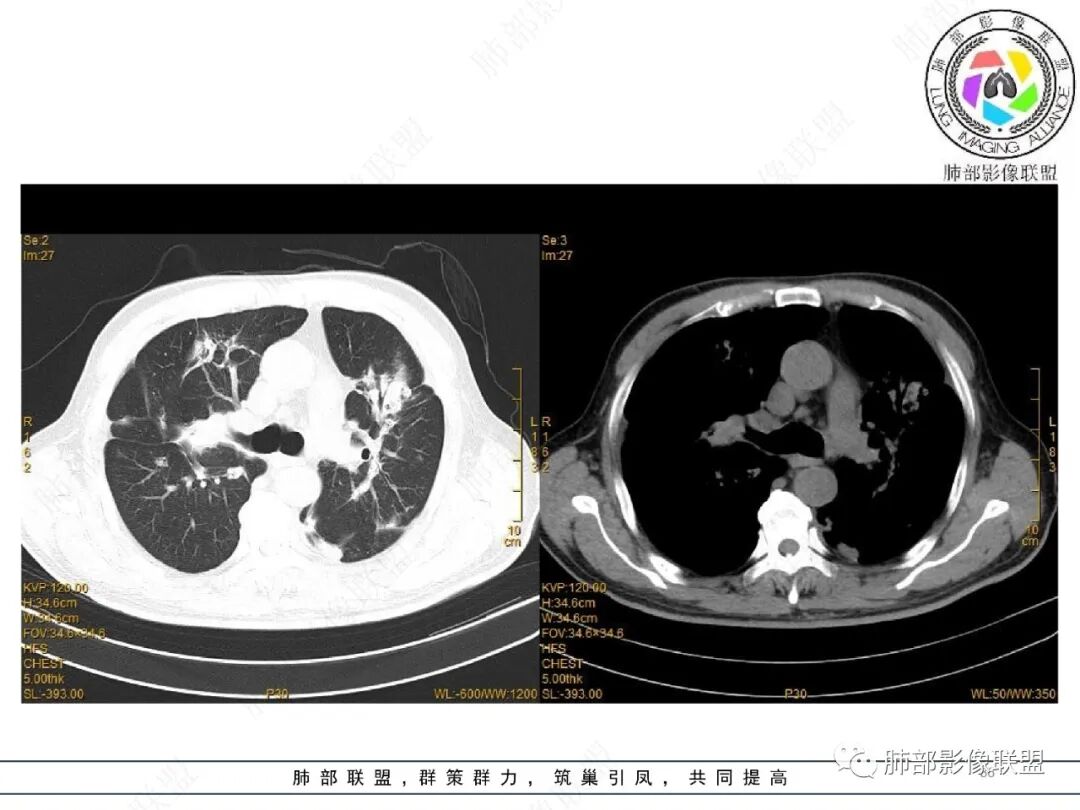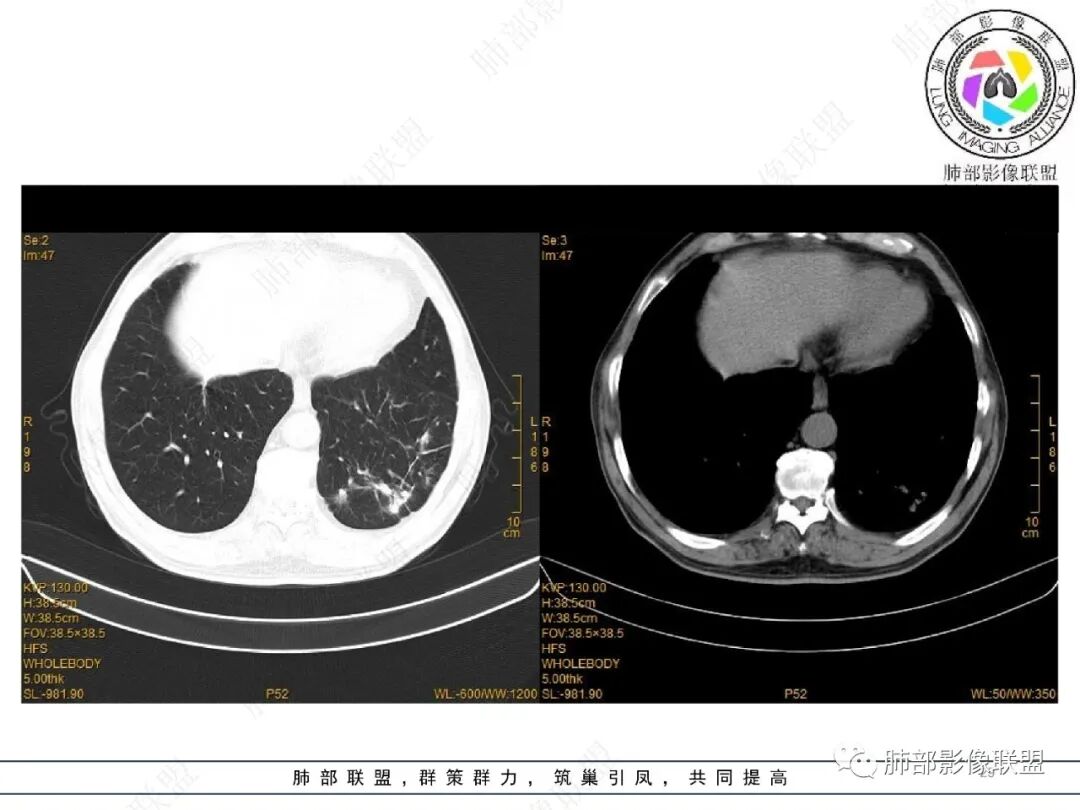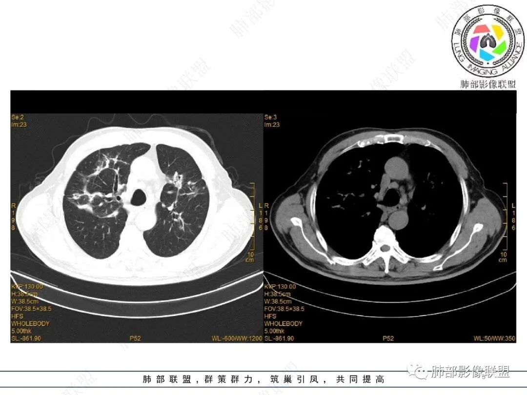 王静 安阳地区医院CT: 双肺弥漫性实变,沿着支气管血管束分布,中内带为主。患者临床症状轻,影像重,实验室检查白细胞,中性粒高,支持合并感染。抗MPO抗体阳性。支持ANCA相关性血管炎合并肺部出血可能,支持MPA