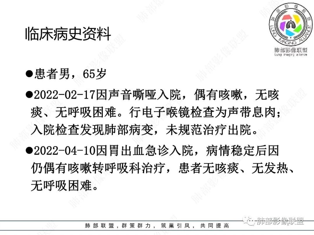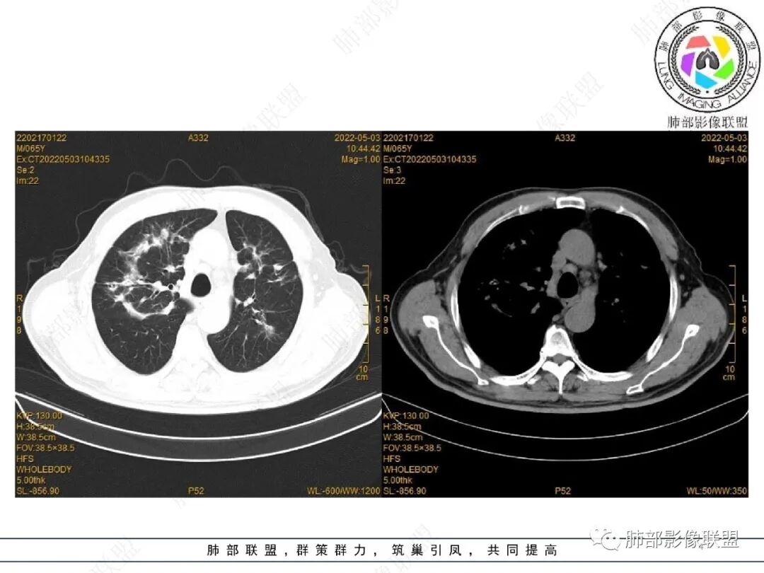 65岁男性。2022.2.17因声音嘶哑入院检查发现肺部病变,未规范治疗出院。2022.4.10因胃出血急诊入院,病情稳定后有咳嗽转入呼吸科治疗,无咳痰、无发热、无呼吸困难。白细胞、中性粒细胞轻度升高,血沉升高,抗髓过氧化物酶抗体IgG阳性,余实验室检查(-)。