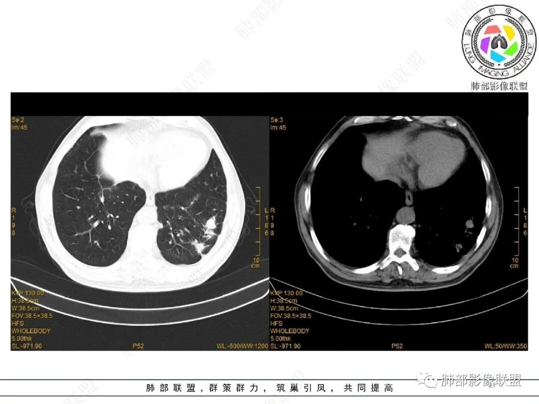 老年男性,两肺多发病灶,整体呈OP样改变,至于是原发性还是继发性的OP,需要临床鉴别。此病例穿刺结果是隐球菌。该病例CT上缺乏隐球菌典型的“在那遥远的胸膜下,多个蘑菇兄弟,可以侧向融合呈长串状与胸膜平行”影像表现,更多是OP样改变,仅凭临床表现或影像资料诊断隐球菌难度比较大。当然也不除外二元论,导致隐球菌的影像表现被掩盖。