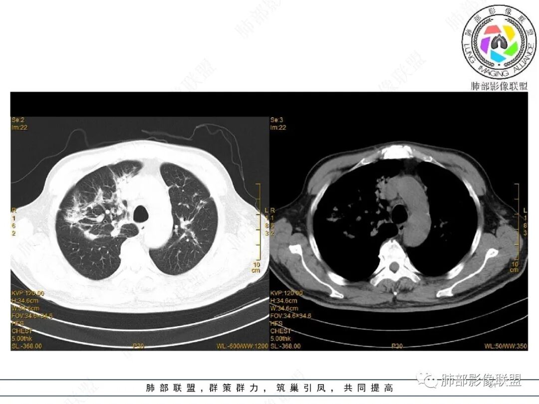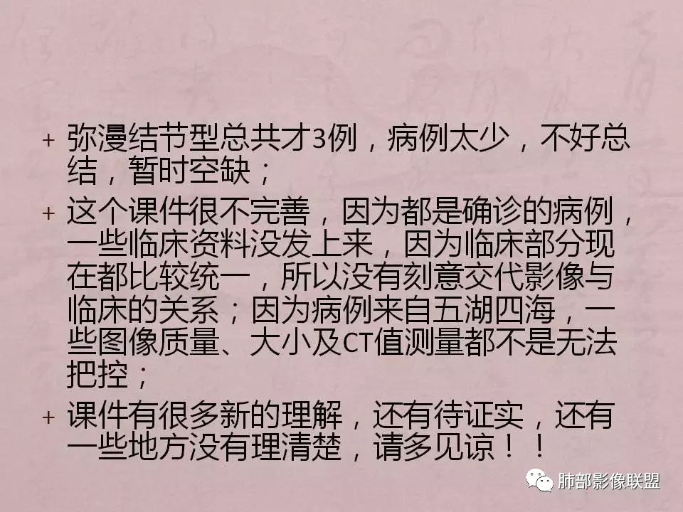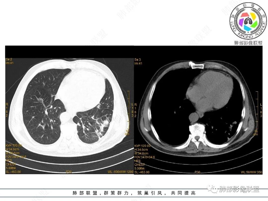 金豆: 两肺弥漫病灶,征象逍遥,支气管血管束走行,边缘模糊,反晕,整体有收缩感,良,非感染,OP。